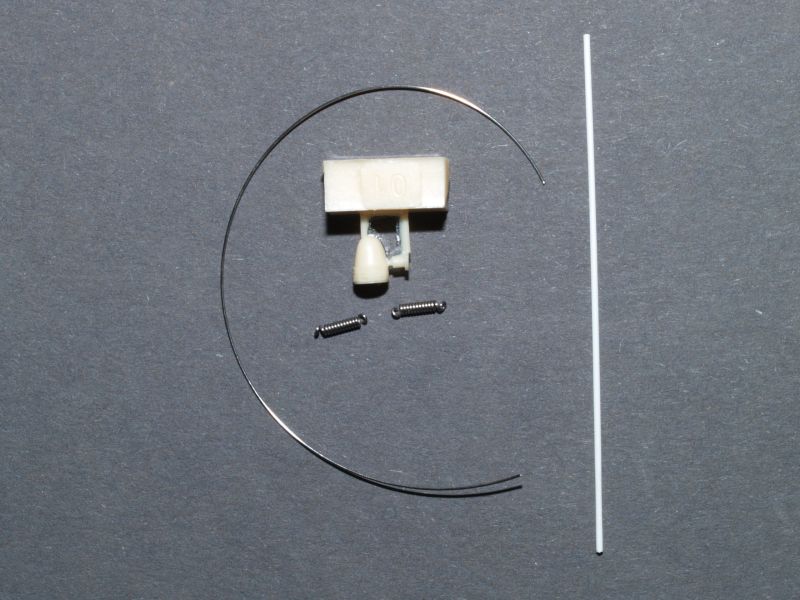 Dieses Set umfasst fünf mittlere, sechs kleine PE Platinen, Plastikrundmaterial, zwei kleine Federn aus Stahl, ein Stück Draht und eine Hupe aus Resin.