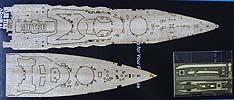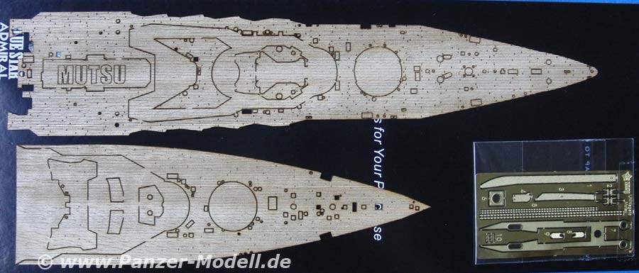Dieses Set bietet ein Holzdeck und PE Teile für das 1/700 Modell der Mutsu von Tamiya.