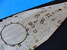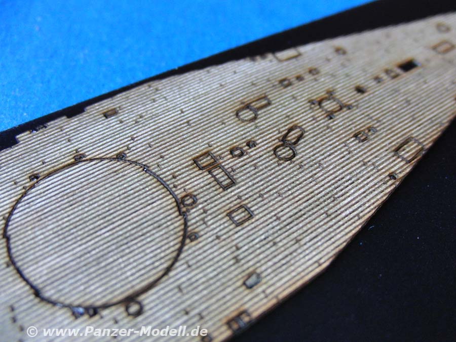 Das Holzdeck ist aus hauchdünnem Holz exakt zugeschnitten und mit entsprechender Plankenstruktur versehen. Die Bereiche von Aufbauten und Details sind entsprechend eingraviert ins Holz.