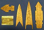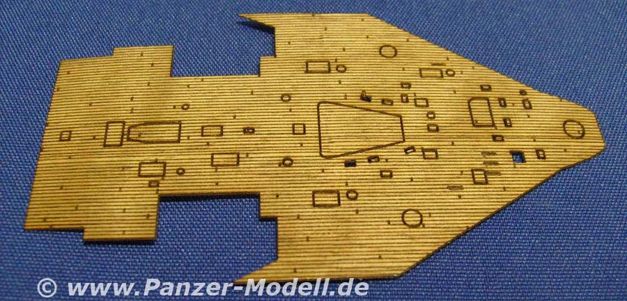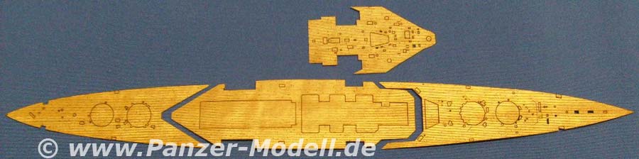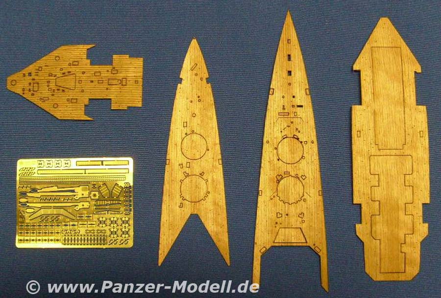 Das vorliegende Echtholzdeck für die HMS Hood besteht aus mehreren Decksteilen und einer Ätzplatine. Die Holzteile sind wie gewohnt selbstklebend und papierdünn. Alle Ausschnitte für Decksaufbauten u. Ä. sind präzise lasergeschnitten und fallen förmlich von allein aus den Decksteilen. Die Ätzteilen stehen dem in nichts nach. Von Ankerketten, über die Wellenbrecher auf Deck, bis zu den übers ganze Deck verteilten Pollern und Rettungsboothalterungen. Alles in feinster Qualität ins Blech geätzt. Wenn die Teile nun auch so passen, wie sie aussehen (wovon wir ausgehen), dann ist dieses Set mal wieder nur wärmstens zu empfehlen. Allerdings sollte man dann auch eine geätzte Reling anbauen. Und wenn die dran ist muss man eigentlich auch die Niedergänge aus Ätzteilen bauen. Und dann sieht es blöd aus ohne geätzte Antennenanlage. Und dann ... |