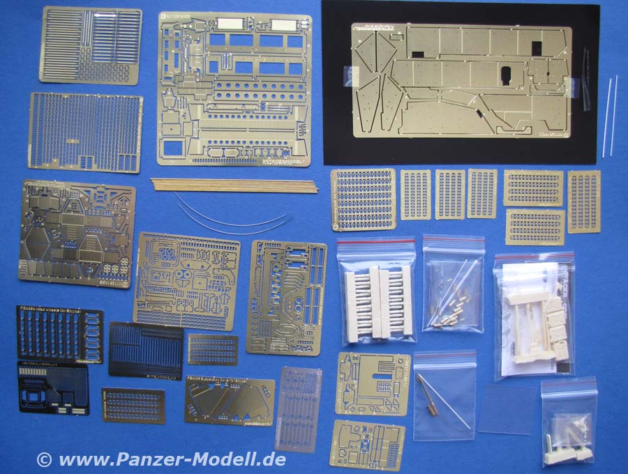 An Teilen zur Ersatz am Modell finden sich im Set: Das MG Rohr aus Metall mit Waffenstation und Schutzschild aus PE Teilen, MG Gurt, MG aus Resin, Radkästen, Kanisterhalterungen, Antennenbasen und Antennenhalterungen, Staukästen mit Zurrösen, Werkzeughalterungen, Zurrriemen, Türverriegelungen, Lüftergitter, Handgriffe, Nebelwurfbecher, Zusatzpanzerplatten, Werkzeug und Kanister, usw.