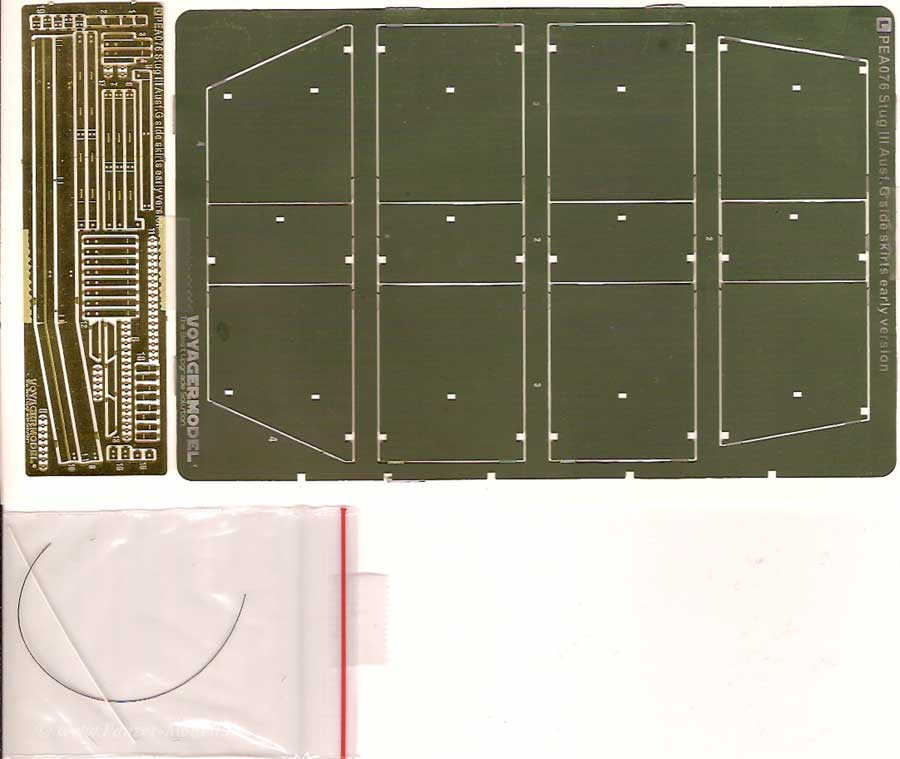 Mit der Nummer PEA076 gibt es von Voyager ein Set Seitenschürzen für StuG III Ausf.G im Maßstab 1/35.