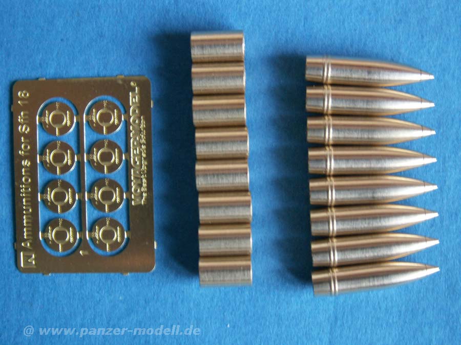 Dieses Set umfasst acht Granaten und acht hohle Kartuschen, sowie acht PE Bodenstücke für diese mit Details.