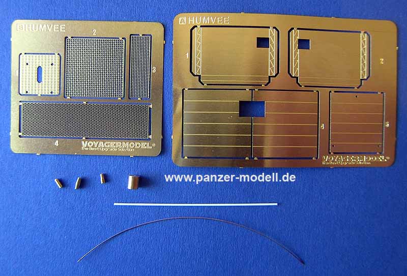 Dieses kleine, aber feine Set besteht aus zwei Platinen mit PE Teilen für die Nachrüstung der CIP Panels an den Türen und auf der Motorhaube. Weiterhin findet sich eine neue Antiskidplate für den Bediener der Waffenstation. Bei dem Plastikteil aus dem Basisbausatz ( Teil F9 ) wird die Oberfläche abgeschliffen und anschließend durch dieses fein detaillierte PE-Teil ersetzt. Für das Kühlergrill und die Öffnung in der Motorhaube liegen noch feine Gitterabdeckungen bei.