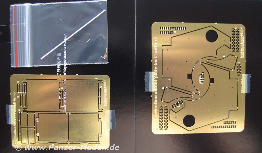 Enthalten sind die Zusatzschutzbleche für die 6 Lüfteröffnungen auf dem Motordeck mit den entsprechenden Halterungen, sowie die doppelschichtige Zusatzpanzerung auf dem Schmalturm des Panther F.