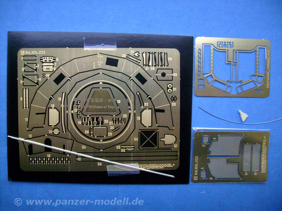 Enthalten ist der Turm als ein Teil zum zusammenfalten, die Abdeckungen mit Halterungen und natürlich das entsprechende Abdeckgittermaterial. Die Griffe dafür müssen selber gebogen werden. Dazu gibt es Scharniere, die Doppelpanzerung vorn und weitere Gimmicks für das Sdkfz.222 wie das Motorgitter Nummernschilder,Kolonnenfahrgerät, Stander, Schaufelblatt, usw.