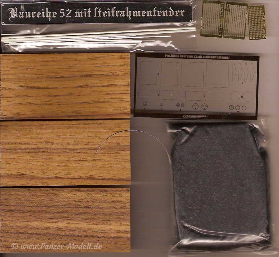 Fangen wir mit den PE Teilen an - ganze 19 große PE Platinen, 3 kleine PE Platinen und ein fotogeätztes Schild für eine Dioramenplatte mit dem Schriftzug "Baureihe 52 mit Steifrahmentender" - allein letzteres eine innovativ, gute Idee.