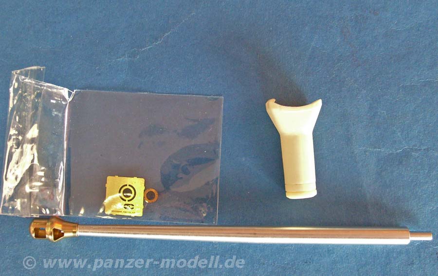Dieses Set umfasst ein Metallrohr für Tiger II mit "Porsche Turm" mit mehrteiliger Metallmündungsbremse, PE Teile und die Geschützblende aus Resin.