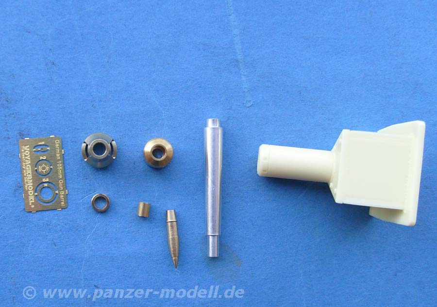Dieses Set umfasst ein Metallrohr für die 10,5cm StuH mit mehrteiliger Metallmündungsbremse, PE Teile und die Kastenblendeblende aus Resin, sowie eine Granate und eine Kartusche aus Metall.
