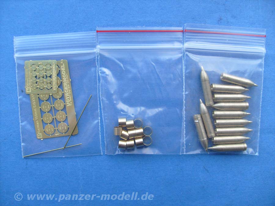 Im Maßstab 1:35 finden sich 12 Granaten aus gedrehtem Metall, sowie 12 Kartuschenhülen und die entsprechenden Bodenplatten für die Granaten und Kartuschen aus Fotoätzteilen. Letzetre sind sehr schön und fein geätzt mit eingestanzter Details.