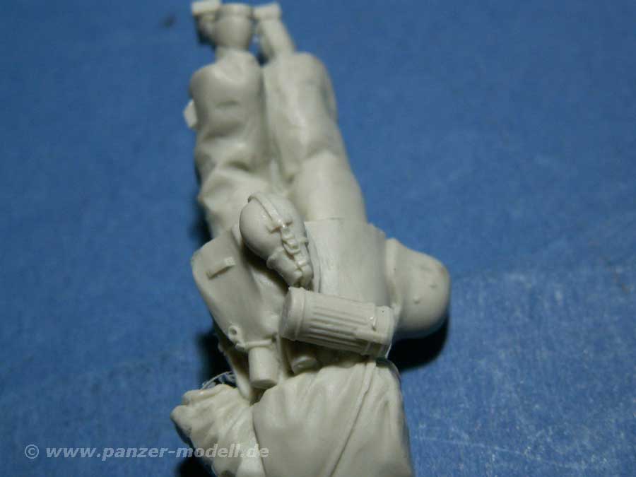 Das Set enthält eine Figur, die aus 4 Einzelteilen zusammengebaut wird plus ein MG42 aus Metall. Die Figur ist in Resin gegossen in sehr guter Qualität - schöne Details, die fein modelliert und realistisch dargestellt sind - der Faltenwurf ist perfekt - gerade mit den hochgekrempelten Ärmeln, es gibt Hinterschneidungen, feingliedrige Finger, angegossenes Gerödel am Gürtel und einen gut gemachten Kopf und markanter Frisur. Der Kopf weist an der Seite einen leichten Gussgrat auf, der sicher schnell entfernt ist.