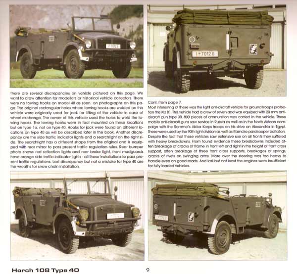 Neben 24 Seiten farbigen Aufnahmen von einem Horch 108 Typ 1a und zwei Typ 40 gibt es gute schwarzweiss Zeichnungen des Chassis und einen großen Haufen schwarzweiss Fotos von allen möglichen Details der Fahrzeuge. Dabei sind auch hier wieder Fotos von Fahrzeugen während der Restaurierung zu sehen, was ungewohnte und tolle Einblicke gewährt. Neben den gewohnt guten Aufnahmen aller möglichen Details wie Motor, Fahrwerk, Innenraum, usw., gibt es viele gute Bildunterschriften und techniche Daten. Dabei wird auf den Fotos dankenswerterweise zwischen den beiden Versionen unterschieden.