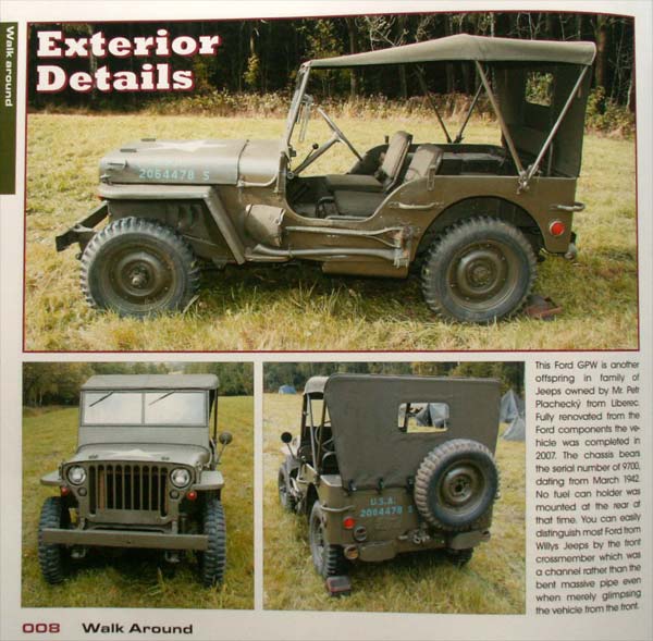 Der Band beginnt mit einigen sehr guten Gesamtansichten und Detailfotos der verschiedensten Fahrzeugbereiche - Fahrwerk Motorhaube, Motorraum mit Motor, Beleuchtung, Reifen, Innenraum mit Armaturenbrett, Sitze, etc., Fahrwerksrahmen, usw. Dazu wird textlich auf die Entstehungsgeschichte des GPW Jeeps mit Produktion, Merkmalen, usw. eingegangen.