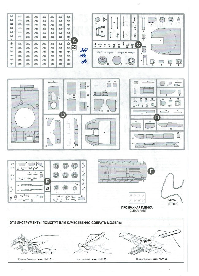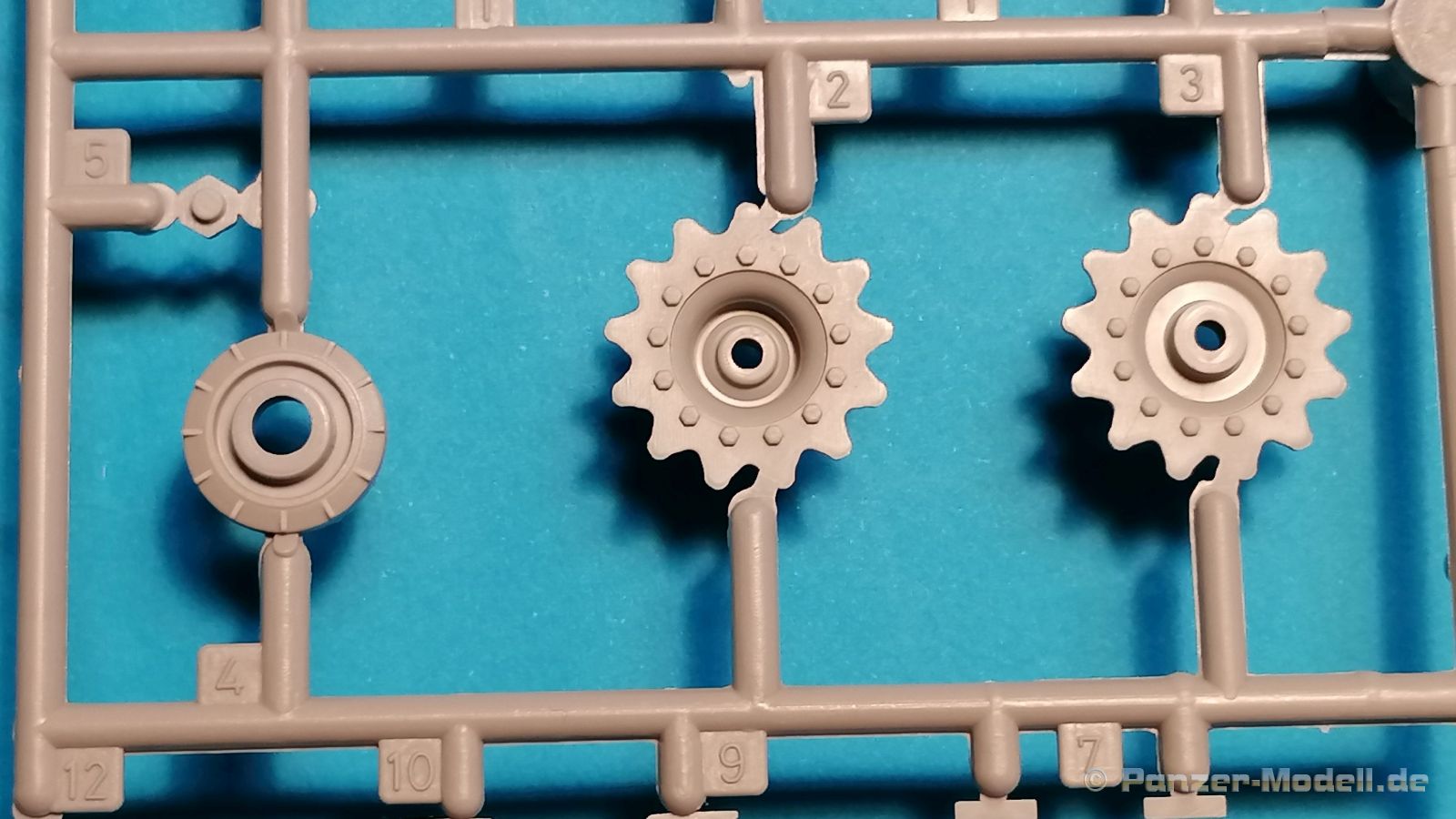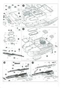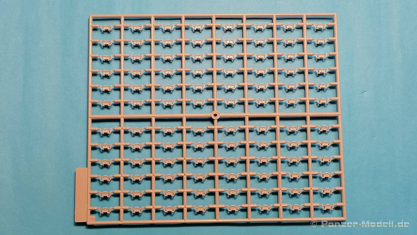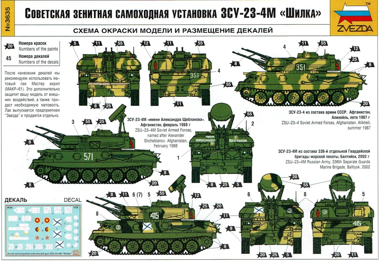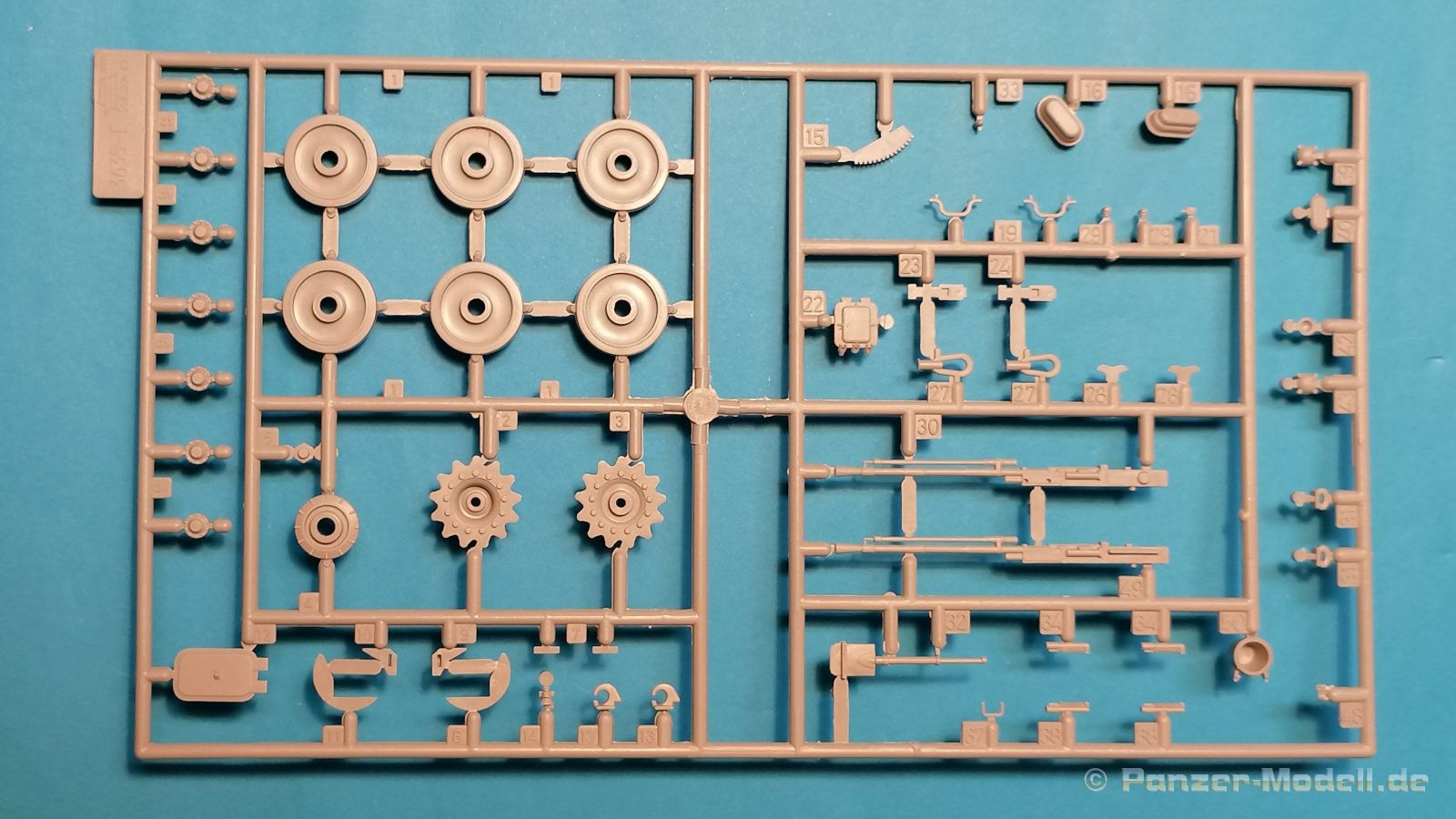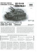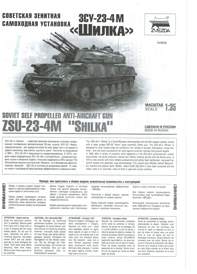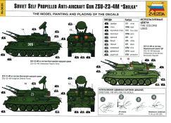 Eine Faltschachtel (345 x 245 x 70mm) beinhaltet einen stabilen Karton mit Klappdeckel. Die Vorderseite ziert ein ansprechendes Titelbild. Auf der Rückseite finden sich vier Fotos eines gebauten Modells. Nach Angabe des Herstellers sind 389 Teile zu verbauen. Die Länges des fertigen Modells wird hier mit 18,6 cm angegeben. Darin finden wir sieben Spritzlinge aus grauem Material und das Panzerkastenunterteil, versehen mit dem Hestellerjahr 2020. Ein Bogen Klarsichtfolie eine Schnur, Decals und die typische Zvezda-Bauanleitung vervollständigen den Inhalt. Ein DIN-A5 Blatt mit verschiedenen Bemalungsvorschlägen und Farbangaben (?? und Tamiya), beidseitig bedruckt, liegt auch bei. Das Material macht wieder einmal einen sehr guten Eindruck. Recht stabil, aber gut bearbeitbar. Alle Teile sind sehr gut umgesetzt und auch sehr gut gegossen. Die Angüsse sind relativ klein und auch gut gesetzt. So finden sich hier klar definierte Kanten, Bolzen, Nieten und dergleichen mehr. Ob Ketten, Schwingarme, Verschlüsse, Lampen, Räder und auch Schutzbügel der Scheinwerfer, alles macht einen sehr guten Eindruck. Allerdings gibt es auch ein paar Kritikpunkte. Das sind erstens die Ketten. Zwar schön gespritz haben wir es mit einer Einzelgliederkette zu tun. Gerade hier wären Segmente sinnvoll gewesen, auch im Hinblick darauf, daß das Fahrwerk nicht beweglich gebaut werden kann. Zwischen den Führungszähnen zeigen sich teilweise mehr oder weniger prägnante Auswerferstellen die es zu versäubern gilt. Leider gibt die Bauanleitung keine Anzahl von Kettengliedern für den Bau eines Kettentrumms vor. Die Bewaffnung ist aus vollem Material gespritzt. Es gilt eine minimale Formtrennnaht zu versäubern und alle Mündungen aufzubohren. Sicher kann man damit ein zufriedenstellendes Ergebnis erzielen, aber ich würde die Rohre durch ein Produkt aus dem Aftermarkt-Sektor ersetzen. Die Bauanleitung führt in 15 Schritten zum fertigen Modell. Klar und überschaubar gemacht sollten keine Fragen auftauchen. In der für Zvezda üblichen Form finden sich auf der linken Seite Zwischenschritte des Baus während auf der rechten Seite die diversen Komponenten zusammengeführt werden. Bei den Rädern ist, bedingt durch den Formenbau, die jeweilige Mittelnaht zu entfernen. Um es gleich vorwegzunehmen, der Panzer hat keinerlei Inneneinrichtung. Also alle Luken zu oder, falls offen, dann mit einer Figur bestückt. Der Decalbogen lässt insgesamt sechs Markierungsoptionen (alle ZSU-23-4M) zu: