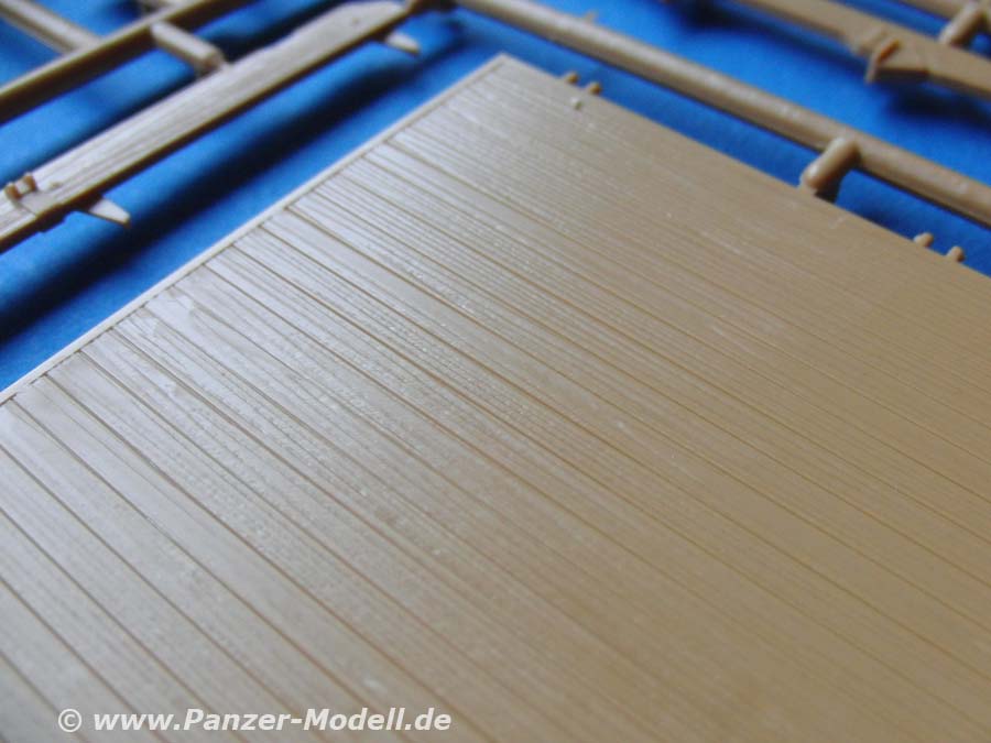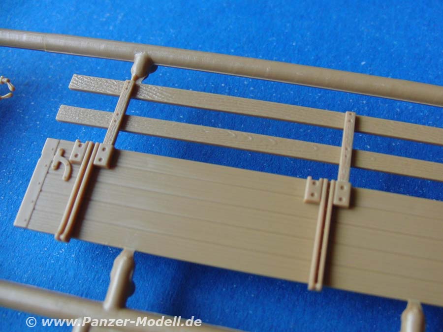 Die Ladepritsche ist sehr gut gelungen mit feiner Holzstruktur und in diesem Bausatz mit zwei verschiedenen Arten ser Seitenwände - einmal die normalhohen Seitenwände und einmal mit zusätzlicher Verlängerung nach oben, wie man es schon aus dem Bausatz 3596 kennt.