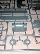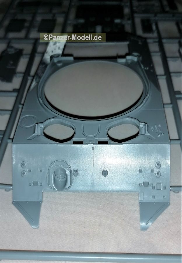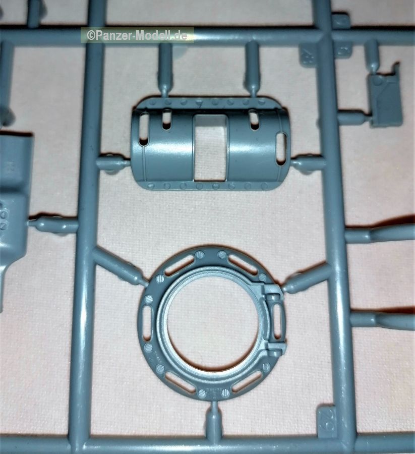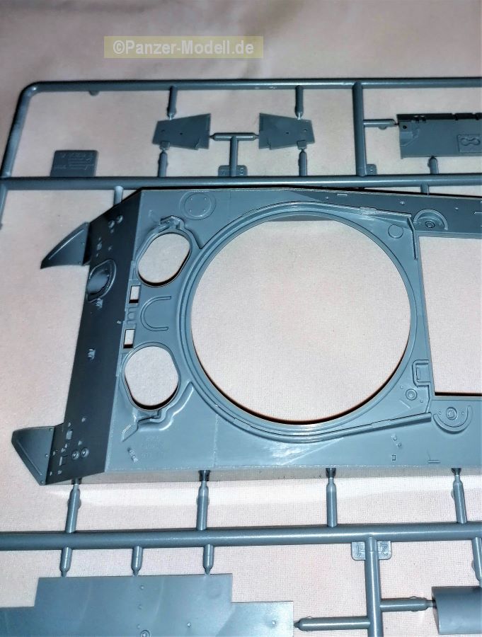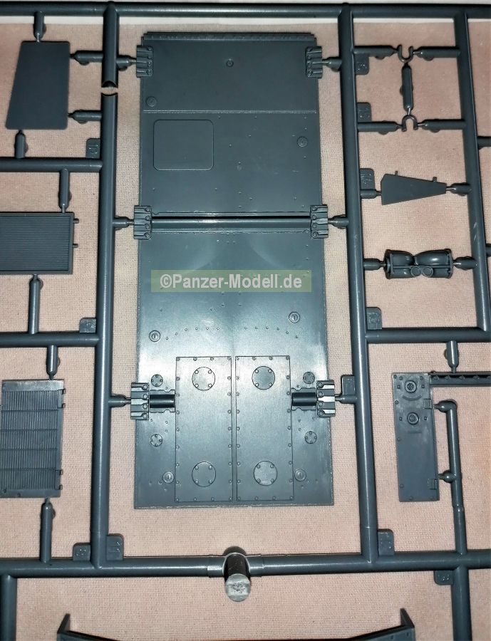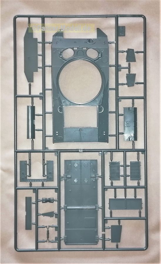 Eine Faltschachtel (345 x 245 x 60mm) beinhaltet einen stabilen Karton mit Klappdeckel. Darin enthalten sind acht graue und und ein Spritzling aus klarem Material. Versehen mit dem Herstellerjahr 2020. Decals und eine Bauanleitung als Faltblatt vervollständigen den Inhalt. Gefühlt sind es relativ wenige Teile die zum Erfolg führen sollen. Lt. Verpackung 277 Teile. Das Material macht einen guten Eindruck. Recht stabil, voraussichtlich aber gut bearbeitbar. Alle Teile sind sehr sauiber abgegossen mit angenehm kleinen Angüssen. Auswerferspuren finden sich auf den ersten Blick nur auf nicht einsehbaren Stellen. Fischhäute sind ebenfalls keine vorhanden. Lediglich die Ketten bilden hier wieder einmal die Ausnahme. Allerdings sind die Markierungen so fein das sie problemlos beseitigt werden können. Alle Bauteile sind zudem sehr gut umgesetzt. Scharf definierte Kanten, Bolzen, Nieten und dergleichen mehr. Ob Ketten, Schwingarme, Verschlüsse, Lampen, Räder und auch Schutzbügel der Scheinwerfer, alles macht einen sehr guten Eindruck. Lediglich die Oberflächen erscheinen einen Tick zu glatt. Die Bauanleitung führt in 18 Schritten zum fertigen Modell. Klar und überschaubar gemacht sollten keine Fragen auftauchen. In der für Zvezda üblichen Form finden sich auf der linken Seite Zwischenschritte des Baus während auf der rechten Seite die diversen Komponenten zusammengeführt werden. Auf der letzten Seite gibt es noch Schablonen für die richtige Platzierung der seitlichen Zusatzpanzerung. Alles narrensicher… J Um es gleich vorwegzunehmen, der Panzer hat keinerlei Inneneinrichtung. Also alle Luken zu oder falls offen dann mit einer Figur bestückt. Das Rohr besteht aus einem Stück und kann wahlweise mit zwei unterschiedlichen Mündungen versehen werden. Die Mündungen der MGs sind noch aufzubohren, aber das ist kein Hexenwerk. Sorgfalt sollte auf jeden Fall der Unterwanne zuteil werden da in diesem Bauabschnitt fünf Teile plus der Heckplatte und des Bugs verbaut werden. Ein Fehler in diesem Bereich dürfte sich durchaus auf die Oberwanne auswirken. Schön gemacht ist auch der leichte Durchhang des oberen Kettentrums. Alles in allem ein Bausatz der unkomplizierten Bastelspaß verspricht. Der Decalbogen lässt vier Varianten zu in Oliv zu: