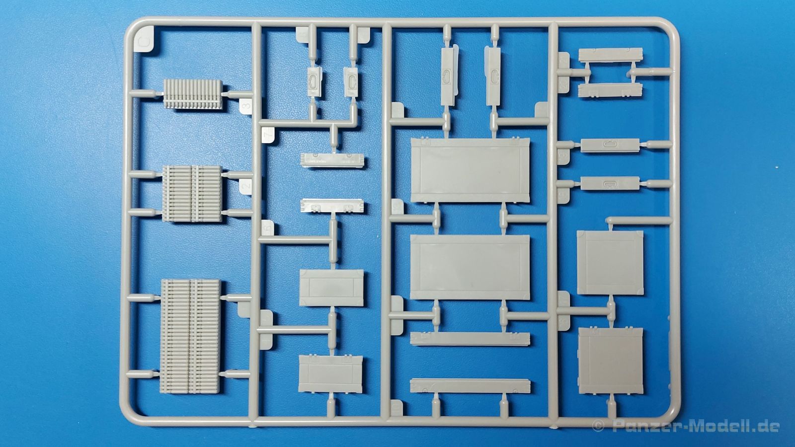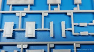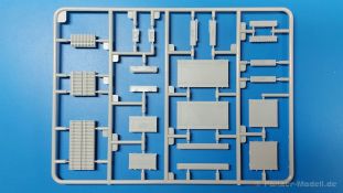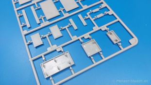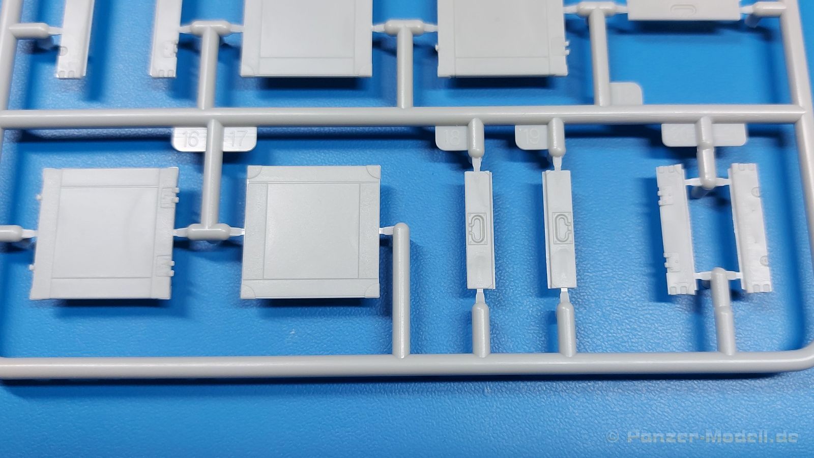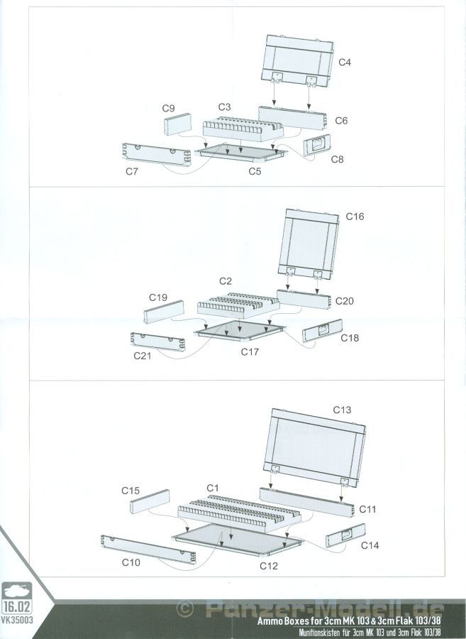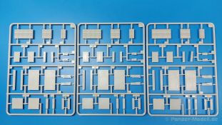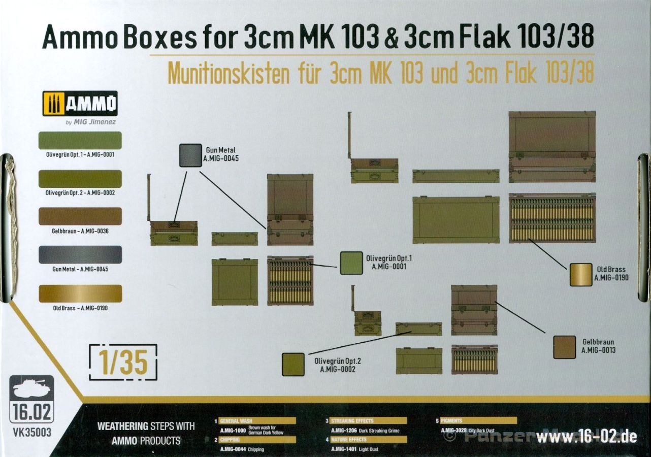 16.02 präsentiert uns sein 3. „Modell“ in Form von Dioramenzubehör für seine 3cm Bordkanone MK103. Es handelt sich dabei um 3 cm Munitionskisten in drei Größen. Der Karton mit Klappdeckel ist stabil und 200 x 145 x 25 mm groß. Er enthält drei gleichartige, hellgraue Spritzlinge. Der Guß ist sauber ausgeführt, ohne Sinkstellen oder Versatz. Hier und da ist leichter Grat zu sehen. Auf den Rückseiten größerer Teile sind hervorstehende und flache Auswerfermarken vorhanden. Sofern man die Kisten geschlossen baut, werden die Marken nicht stören. Nur bei geöffneten Kisten wird man versäubern müssen. Jede Kiste besteht aus Boden, vier Seitenwänden, dem Deckel und einem Einsatz mit 3 cm Munition. Boden und Deckel sind beidseitig detailliert. Scharniere, Tragegriffe, Metallverstärkungen an den Ecken und die ineinandergreifenden Zapfen und Nuten sind sehr fein und schön wiedergegeben. In den Böden sehen wir eine umlaufende Nut, in die die Federn der Seitenwände eingreifen und für eine sichere Verbindung sorgen. Wie gesagt, gibt es drei Größen. Für die kleinste gibt es einen Einsatz mit 45 Patronen 3 cm Munition, für die mittlere mit 90 Patronen und für die größte mit 180 Patronen. Es ist jeweils nur die oberste Patronenlage und eine, bzw. zwei Halteleisten zu sehen. Es wäre vielleicht schön gewesen, wenn die Einsätze Variationsmöglichkeiten wie z.B. eine Teilentnahme der Munition angeboten hätte. Ohne Nacharbeit kann man nur volle Kisten darstellen. Eine einseitige Bauanleitung ist dem Bausatz beigelegt. Je Kiste ist ein Bauschritt vorhanden. Auf der Kartonrückseite finden wir Bemalungs- und Verwitterungshinweise mit Farbangaben ausschließlich zu AMMO by Mig-Farben. Bei drei Spritzlingen mit je einer Kiste in jeder Größe bekommt man 9 schöne Kisten zur Beladung von Fahrzeugen oder Ausschmückung von Dioramen/Vignetten. Der Zusammenbau ist einfach und der Preis zwischen 12 und 15 Euro annehmbar. Wir bedanken uns bei 16.02 für das Besprechungsmuster.