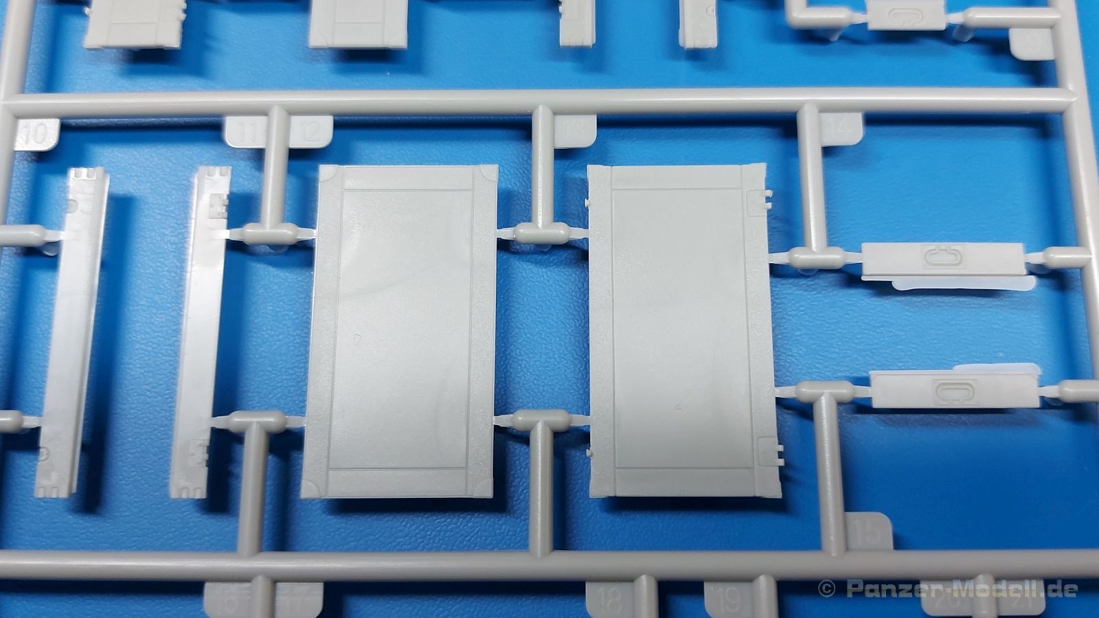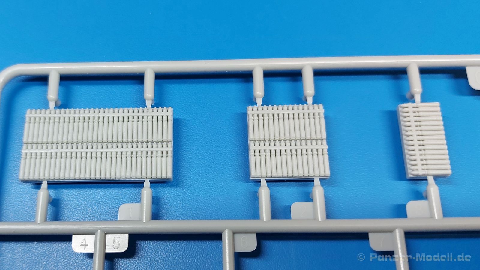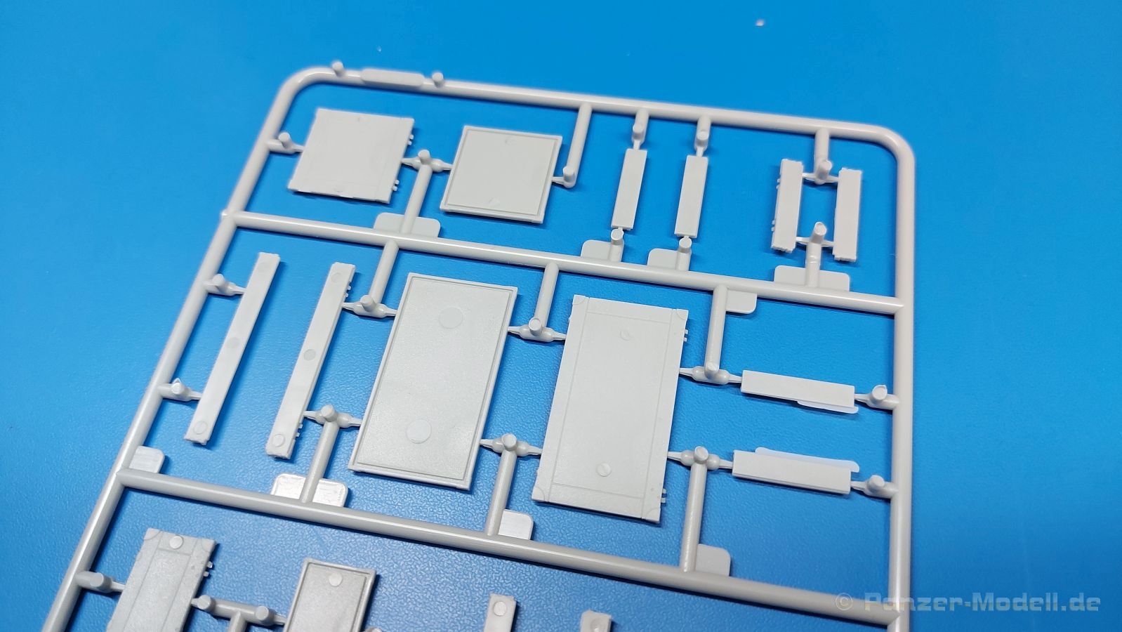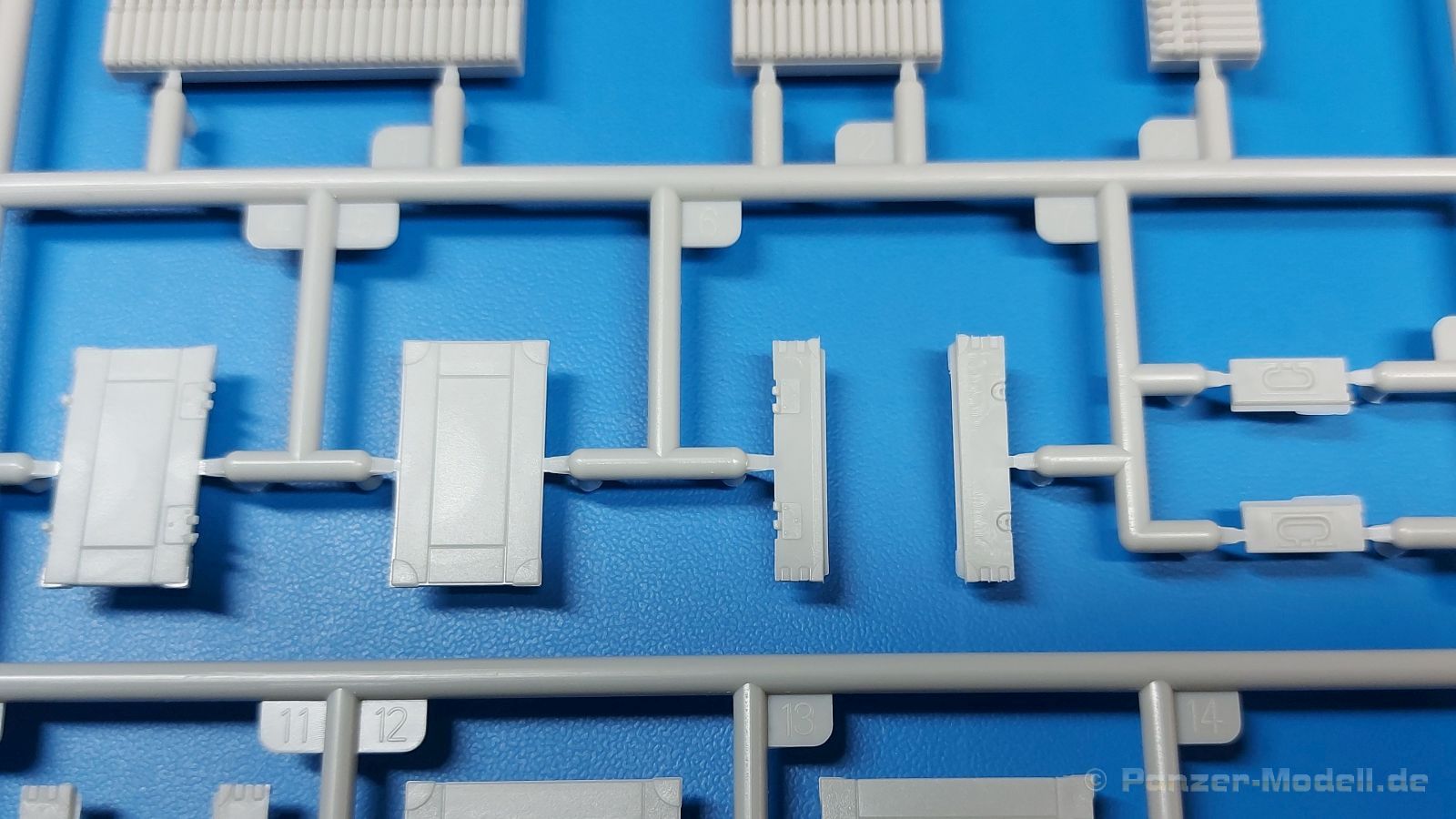 16.02 präsentiert uns sein 3. „Modell“ in Form von Dioramenzubehör für seine 3cm Bordkanone MK103. Es handelt sich dabei um 3 cm Munitionskisten in drei Größen. Der Karton mit Klappdeckel ist stabil und 200 x 145 x 25 mm groß. Er enthält drei gleichartige, hellgraue Spritzlinge. Der Guß ist sauber ausgeführt, ohne Sinkstellen oder Versatz. Hier und da ist leichter Grat zu sehen. Auf den Rückseiten größerer Teile sind hervorstehende und flache Auswerfermarken vorhanden. Sofern man die Kisten geschlossen baut, werden die Marken nicht stören. Nur bei geöffneten Kisten wird man versäubern müssen. Jede Kiste besteht aus Boden, vier Seitenwänden, dem Deckel und einem Einsatz mit 3 cm Munition. Boden und Deckel sind beidseitig detailliert. Scharniere, Tragegriffe, Metallverstärkungen an den Ecken und die ineinandergreifenden Zapfen und Nuten sind sehr fein und schön wiedergegeben. In den Böden sehen wir eine umlaufende Nut, in die die Federn der Seitenwände eingreifen und für eine sichere Verbindung sorgen. Wie gesagt, gibt es drei Größen. Für die kleinste gibt es einen Einsatz mit 45 Patronen 3 cm Munition, für die mittlere mit 90 Patronen und für die größte mit 180 Patronen. Es ist jeweils nur die oberste Patronenlage und eine, bzw. zwei Halteleisten zu sehen. Es wäre vielleicht schön gewesen, wenn die Einsätze Variationsmöglichkeiten wie z.B. eine Teilentnahme der Munition angeboten hätte. Ohne Nacharbeit kann man nur volle Kisten darstellen. Eine einseitige Bauanleitung ist dem Bausatz beigelegt. Je Kiste ist ein Bauschritt vorhanden. Auf der Kartonrückseite finden wir Bemalungs- und Verwitterungshinweise mit Farbangaben ausschließlich zu AMMO by Mig-Farben. Bei drei Spritzlingen mit je einer Kiste in jeder Größe bekommt man 9 schöne Kisten zur Beladung von Fahrzeugen oder Ausschmückung von Dioramen/Vignetten. Der Zusammenbau ist einfach und der Preis zwischen 12 und 15 Euro annehmbar. Wir bedanken uns bei 16.02 für das Besprechungsmuster.