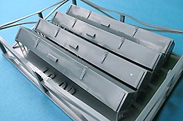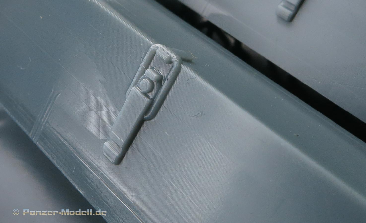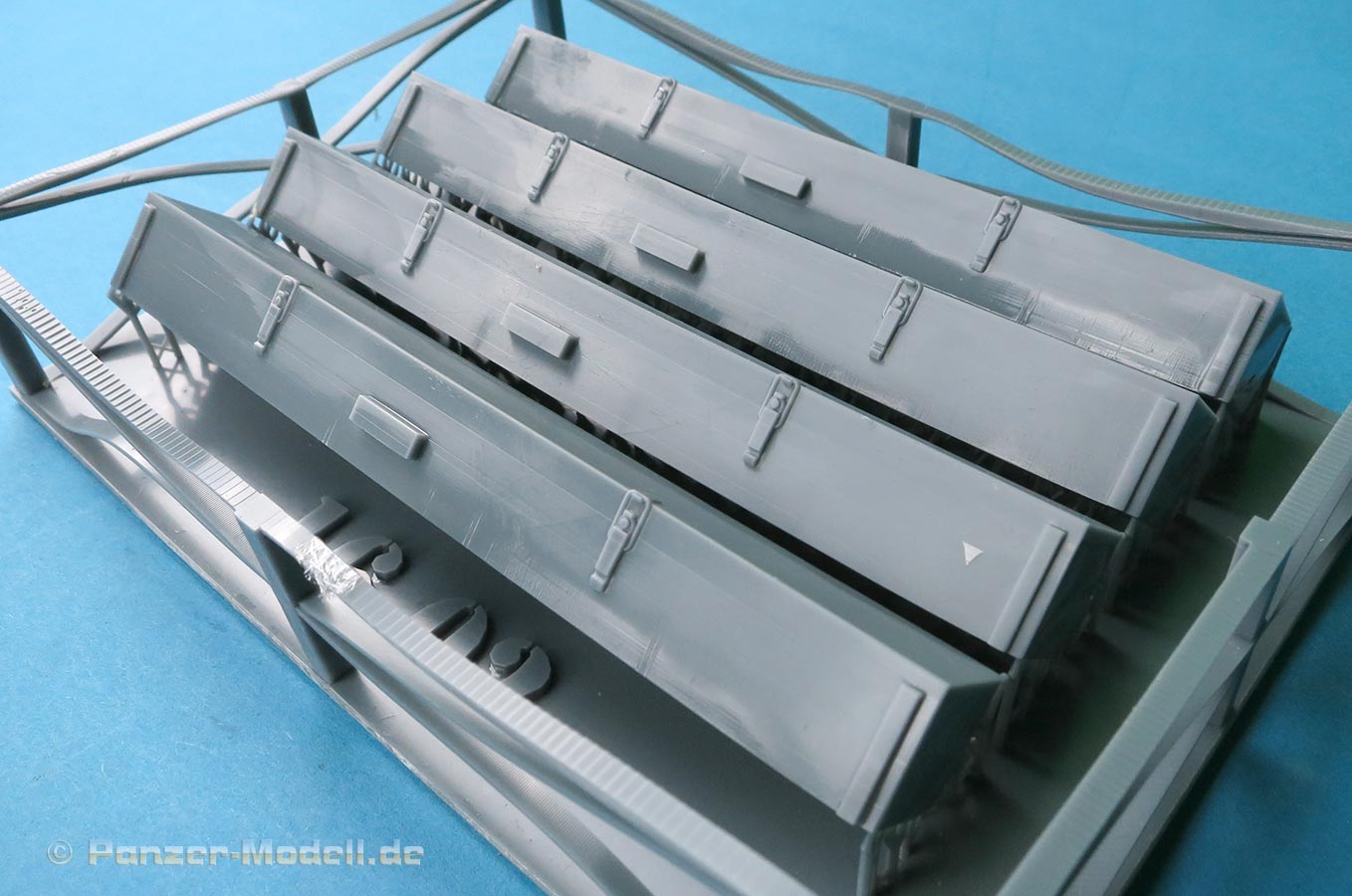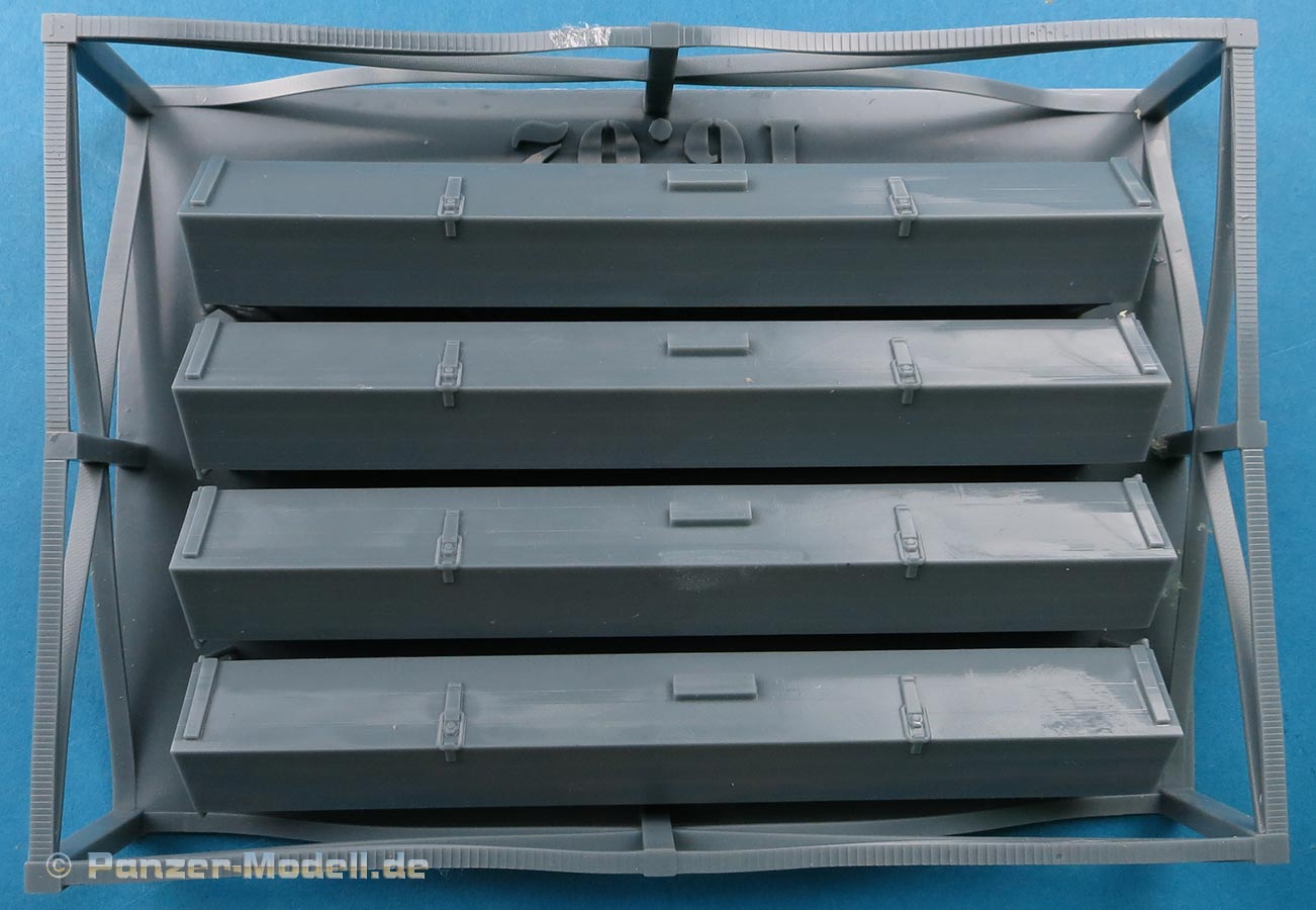 Die Teile sind geschlossene Metallboxenboxen für die Taifun Raketen. Die Details können sich sehen lassen, wobei die Kisten insgesamt relativ glatt sind und nur die Verstärkungen und Verschlüsse ins Auge stechen. In extremer Nahbetrachtung finden sich ein paar Drucklinien an den Oberflächen, die im Normalfall kaum sichtbar sein dürften, aber man könnte auch einmal kurz mit einer Feile rübergehen.