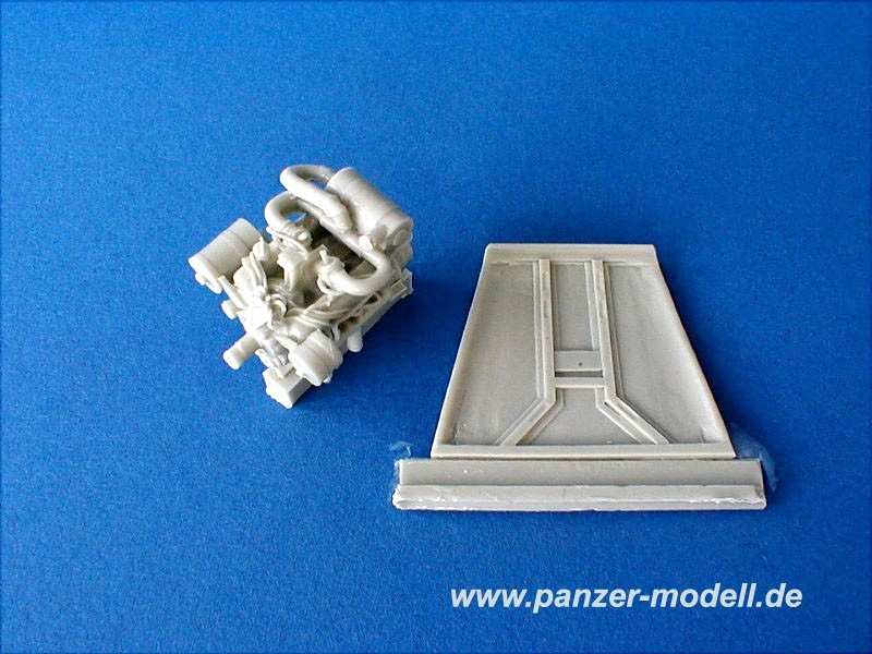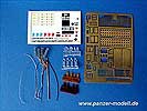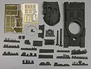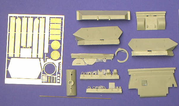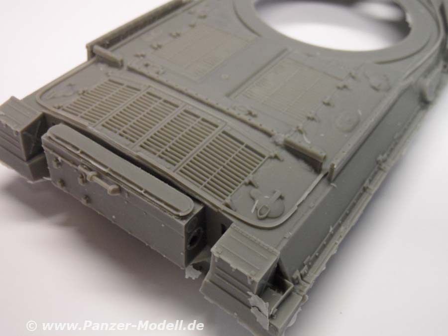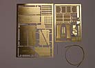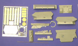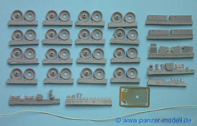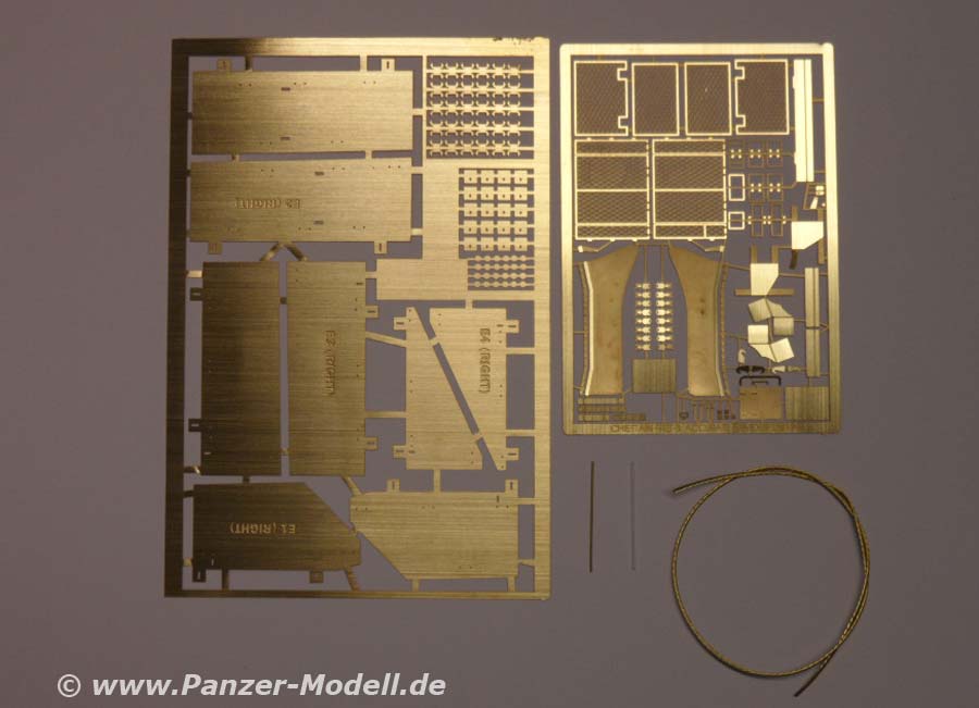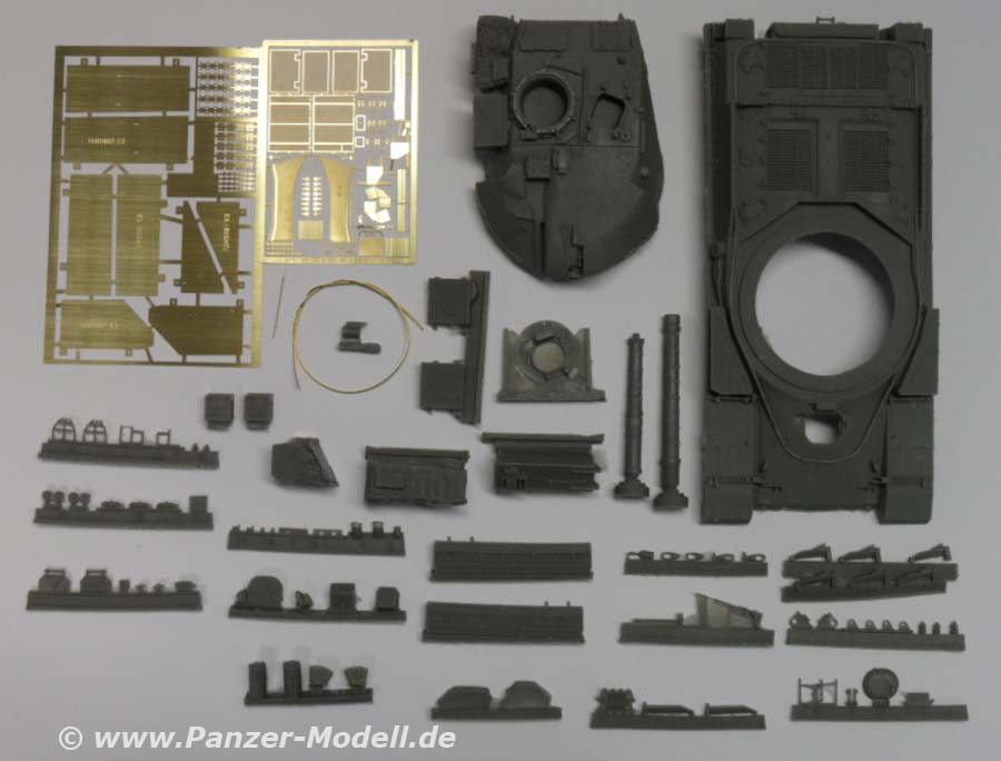 Ergänzt wird das Ganze durch zwei Ätzplatinen, die hauptsächlich Kettenschürzen und Gitter fürs Motordeck enthalten.