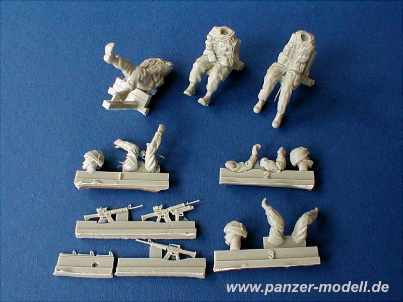 Alle Figuren tragen Helme, Headsets und teilweise Staubschutzbrillen. Fahrer und Beifahrer sind bereits mit angegossenen Sitzen modelliert. Der Granatwerferschütze, ist für die Bedienung der Waffenstation auf der Ladefläche des Landrovers gestaltet. Arme und Köpfe liegen für jede Figur lose bei.