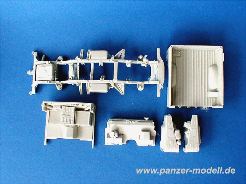 Der Bausatz besteht aus 10 Einzelteilen und 1 Ätzplatine. Somit ist dieser Bausatz sehr übersichtlich. Der Turm und die Einzelteile sind Blasen- und Verzugsfrei gegossen und erfordern keine langwierigen nacharbeiten. Am Turm muß das trapezförmige Bauteil innen angebracht werden und anschließend kann der Boden eingepasst werden. Allerdings muß nach dem Zusammenbau einigen Spalten mit Spachtelmasse zu Leibe gerückt werden. Der Turmboden ist so gearbeitet, das der Originalturm der Maus nur abgenommen werden muß und ohne große umbauarbeiten der neue Prototypturm aufgesetzt werden kann. Vor den Turm kann die Flaschengasbatterie angebracht werden. Diese wurde aber, gemäß meinen Unterlagen (Waffenrevue 5 Hefte), nur bei der Fa. Alkett benutzt um die ersten Fahrversuche zu starten. Diese Fahrversuche wurden entgegen der Anordnung des Reichsministers Speer durchgeführt, um die Theorien des Konstrukteures Ferdinand Porsche zu belegen und zu beweisen, das ein solches Monstrum auch fahrbar ist. der Test verlief sehr erfolgreich, da bei der Ausfahrt aus der halle rechts und links nur noch ein paar cm Platz waren. Später wurde dann der herkömmliche Antrieb benutzt um die Fahrversuche in der Panzerkaserne Böblingen durchzuführen. Nun folgt noch der Fotoätzbogen, der eine Leiter und die Haltegriffe am Turm enthält.