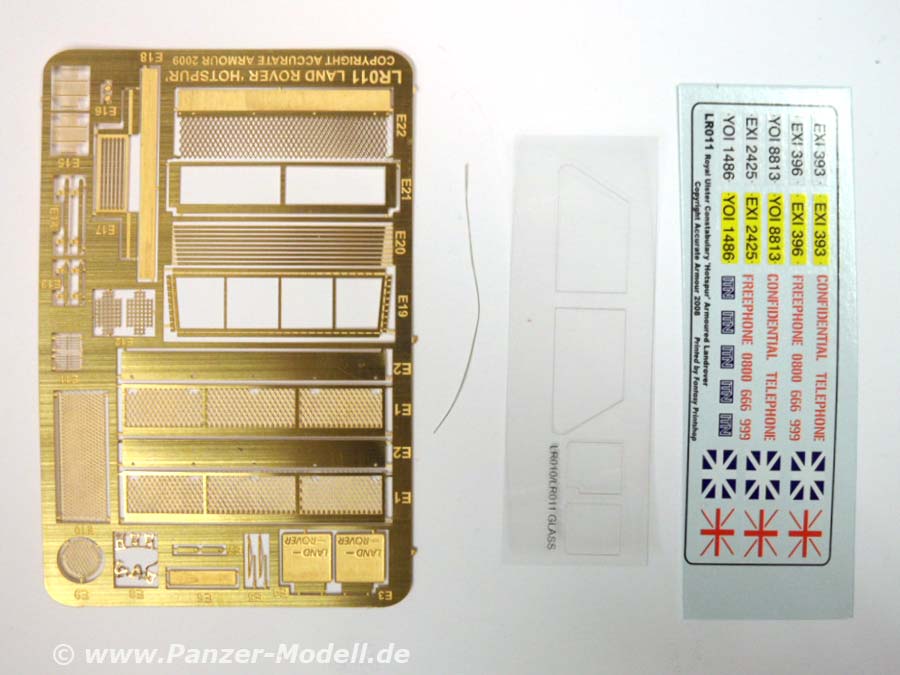 Die Ätzteile stellen später die Gitter und Gummimatten dar, welche verhindern sollen dass böse Menschen mit schwarzen Baretts Mollis oder Bomben unters Auto rollen. Zudem sind natürlich auch die Gitter vor den Fenstern und div. Kleinteile vorhanden.