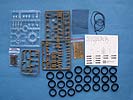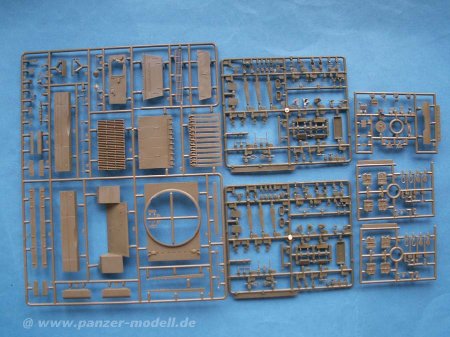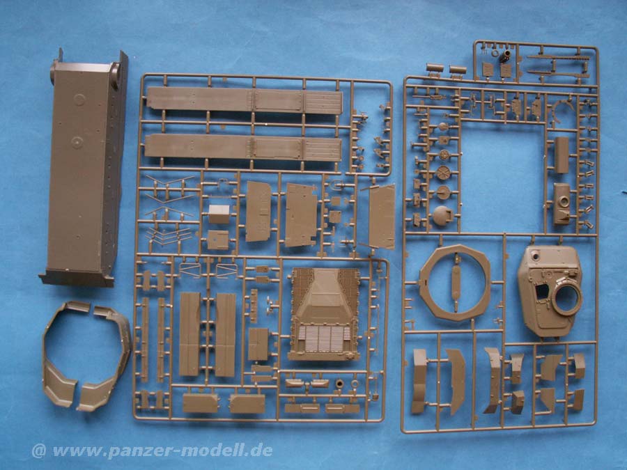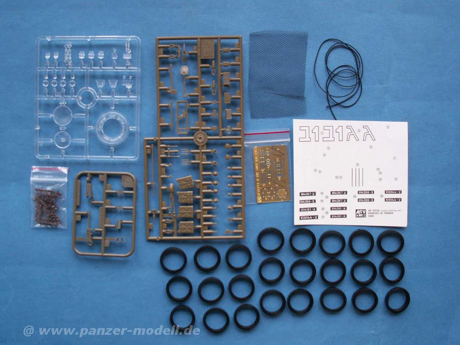 Im Karton finden sich 14 Spritzlinge, die Unterwanne, die beiden Turmhälften, ein Spritzling mit Klarsichtteilen für die Winkelspigel, schön detailierte Vinylketten, Gummibandagen für die Räder, eine Platine mit Ätzteilen, Ersatzkettenglieder, das neue Kanonenrohr aus gedrehtem Alu, Fadenmaterial für die Abschleppseile, Federn für ein funktionierendes Laufwerksfederungssystem, ein Decalbogen und Polycaps.