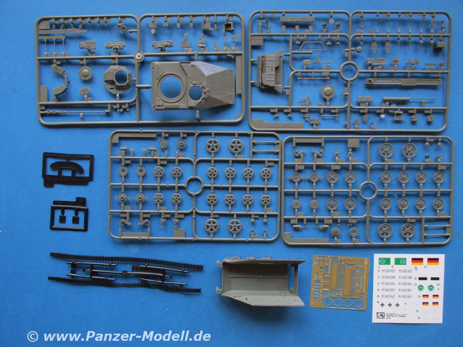 Im Bausatz finden sich aktuell vier Spritzlinge, eine Unterwanne, 3 Vinylspritzlinge, eine PE Platine und ein Decalbogen.