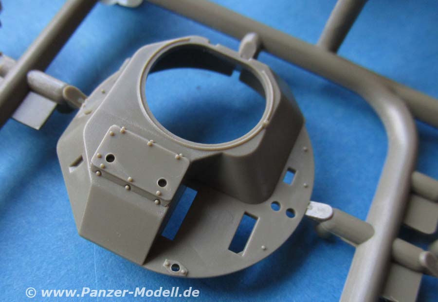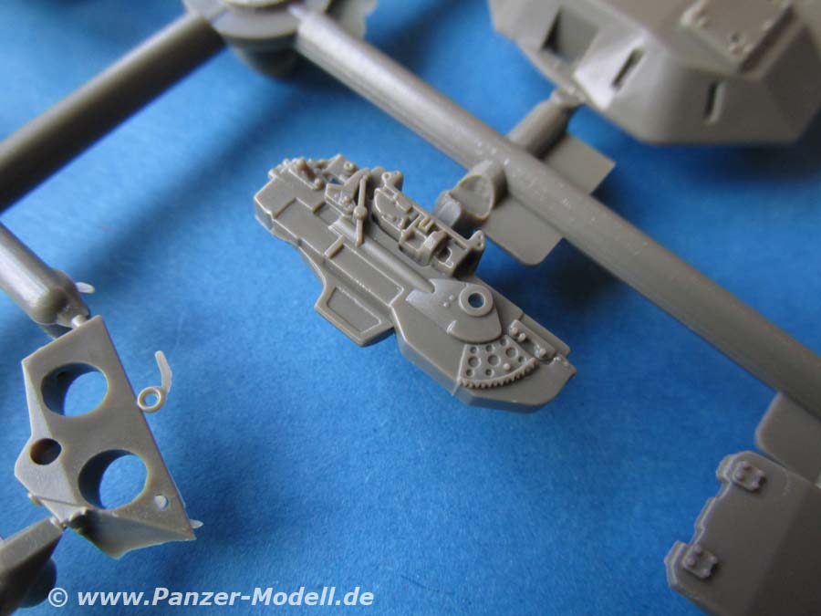 Der Turm mit der Waffenanlage macht einen guten Eindruck. Sogar das 2cm Rohr aus Plastik sieht erstaunlich gut aus mit den offenen Schlitzen des Mündungsfeuerdämpfers - man muss diesen vorn nur vom Anguss befreien und öffnen. Die Munitionsbehälter werden über die Gurtzuführer aus Vinylteilen mit der Hauptwaffe verbunden. Die Gurte sehen soweit ganz gut aus mit darinliegender Munition - hie rmuss man nur eine passende bemalung hinbekommen. Wer die leeren Zuführer darstellen will, muss sich den Eduard PE Satz zulegen.