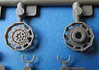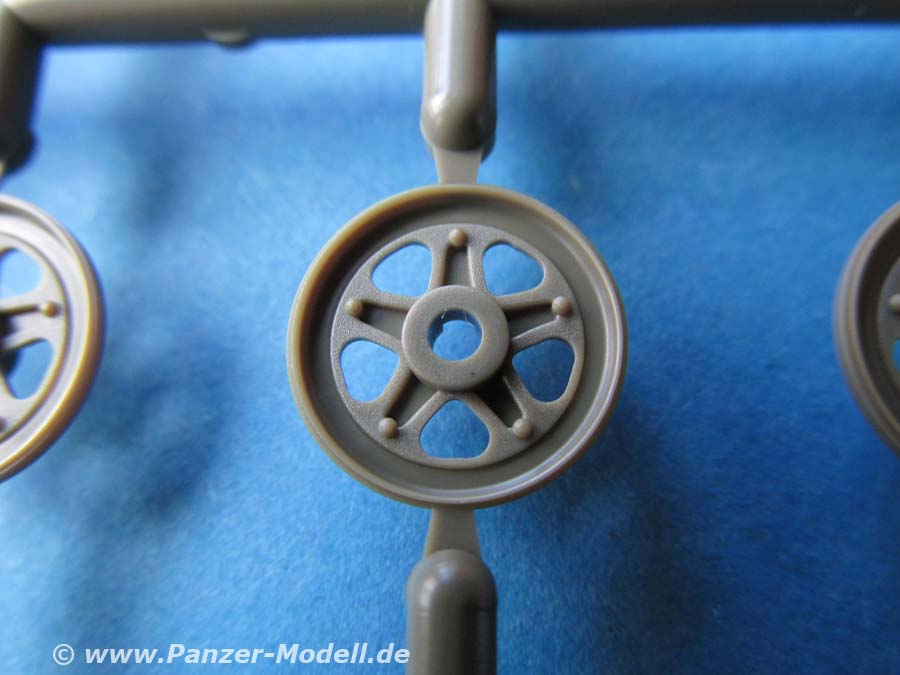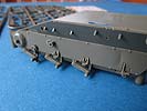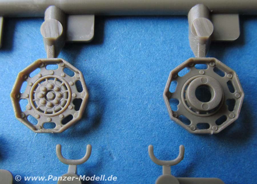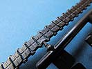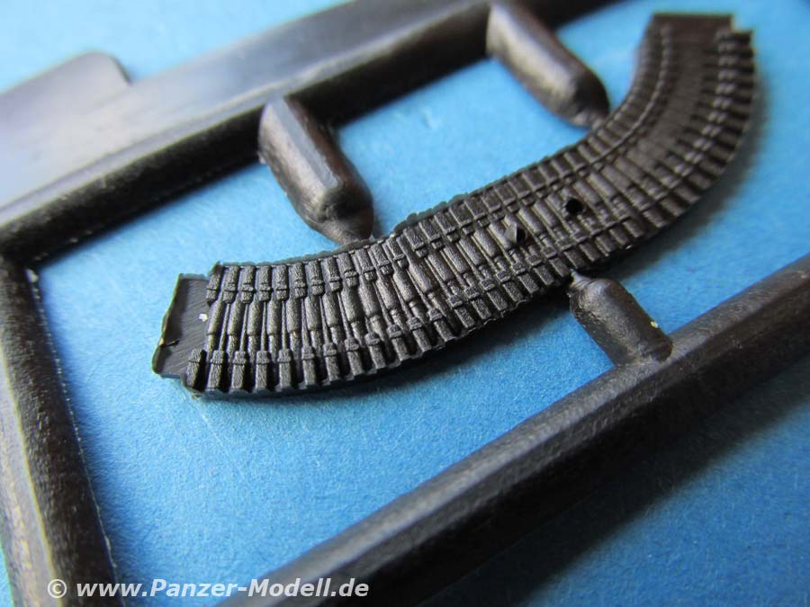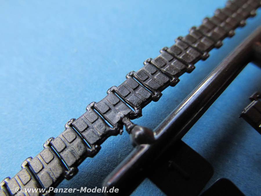 Der wichtigste Unterschied zum alten Bausatz sind die Ketten. Diese wurden am original relativ schnell auf Stahl-Endverbinderketten umgerüstet und bekamen ein neues Treibrad - beides ist in diesem Bausatz berücksichtigt und man kann damit endlich aktuelle Wiesel bauen. Die Kette besteht aus weichem Vinyl das sich gut biegen lässt. Prinzipiell sieht diese gut aus, hat im vorliegenden Fall aber auf der Aussenseite ein paar Schwachstellen im Guss, denn die Struktur der Kettepolster ist stellenweise extrem dünn und die Kanten an den Angüssen ein wenig verzogen. Ich gehe allerdings davon aus, dass man das am späteren Modell nicht sonderlich bemerken würde.