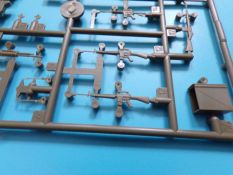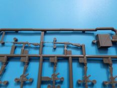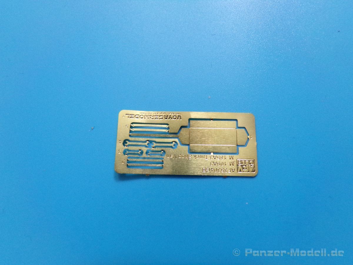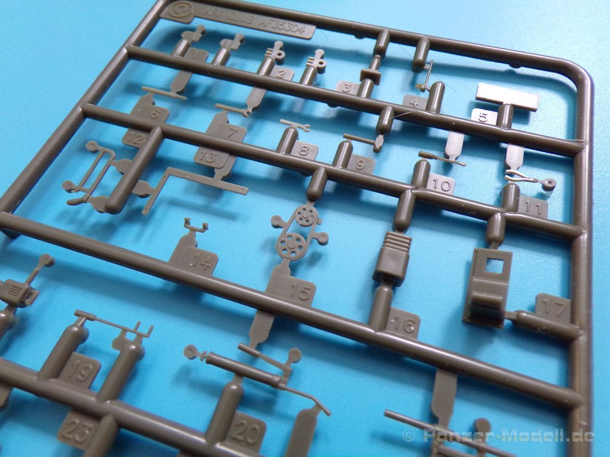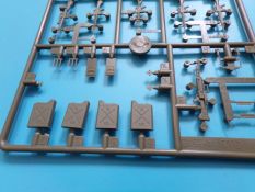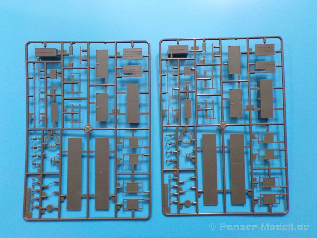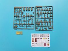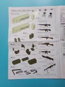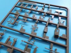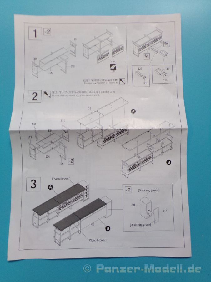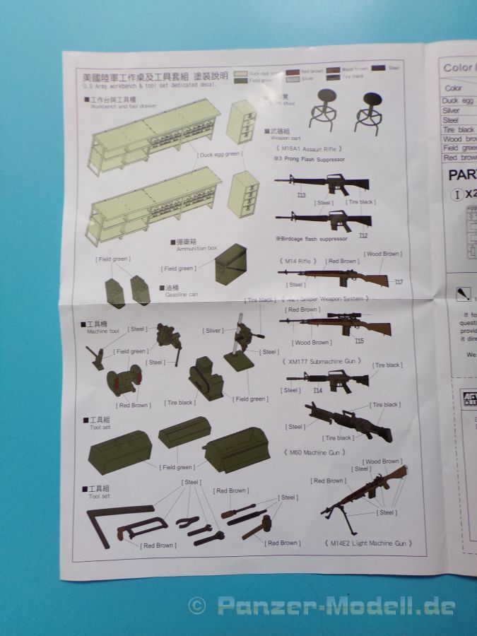Eine voll ausgestattete Werkbank in 1:35 aus Plastikspritzguss wer hätte das vor einigen Jahren gedacht? Lange Zeit gab es solche „ausgefallenen“ Zubehörsätze nur teuer aus Resin zu erwerben. Der rührige Hersteller zeigt und hier wieder einmal beispielhaft, wie eine gute Formenverwertung geht. Fast alle Bauteile gab es bereits in anderen Bausätzen dieser Marke nur eben nicht in dieser Kombination. Insgesamt sind vier Spritzligen im schön gestalteten Karton enthalten. Es können zwei Werkbänke gebaut werden, bei denen die Schubladen teilweise geöffnet dargestellt werden können, dazu passend zwei Drehhocker. An Werkzeug liegt einiges bei: eine Schleifmaschine, ein Kompressor, eine Bohrmaschine, ein Schraubstock, geschlossene und geöffnete Werkzeugkästen sowie Handwerkzeuge wie Bügelsäge, Zange, Schraubendreher, Hammer und Schraubenschlüssel. Für das Innenteil des einen Werkzeugkastens und einiger Werkzeuge ist ein kleiner Fotoätzteilbogen beigelegt. Angesiedelt hat der Hersteller diesen Satz zur Zeit des Vietnamkriegs. Warum genau dieser Zeitraum? Die enthaltenen Waffen sind für Spritzguss ebenfalls hervorragend ausgeführt, und passen zur Vietnam Thematik ebenso wie zur Ausstattung der U.S. Army in Europa und den USA bis weit in die 80er Jahre hinein. Es sind M14, M14E2, M21, M16A1, M60 und XM177 Gewehre vorhanden. Dazu noch ein Munitionskasten und zwei Kanister. Die Bauanleitung zeigt den Zusammenbau der Werkbänke uns sämtlicher Zubehörteile in vier Schritten. Am Ende sind Farbprofile abgedruckt, diese zeigen den Inhalt einmal in der korrekten Farbgebung. Als verwendbare Farben sind folgende Hersteller angegeben: Gunze, Humbrol, Revell und Lifecolor Natürlich kann auch hier jeder nach seinem Gusto entscheiden, und die Farben des Herstellers der eigenen Wahl nutzen.