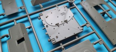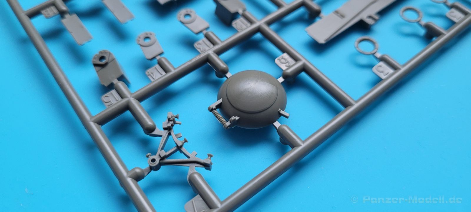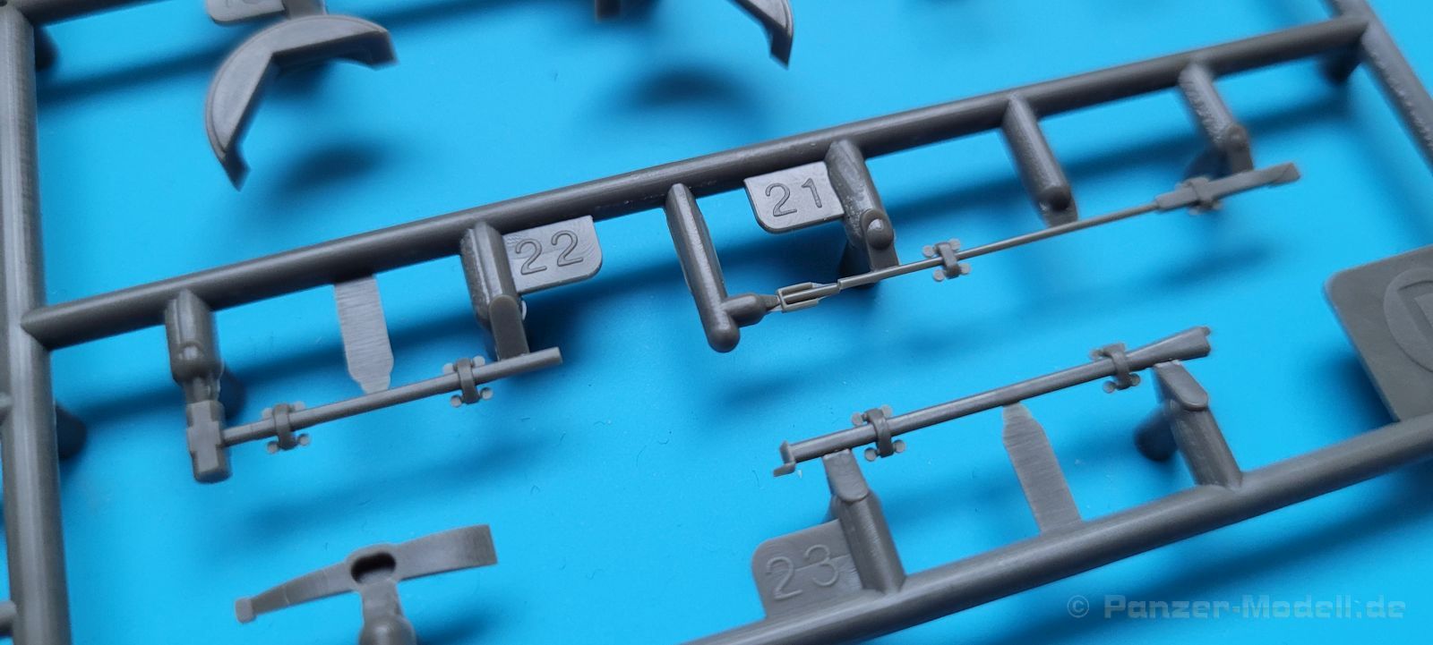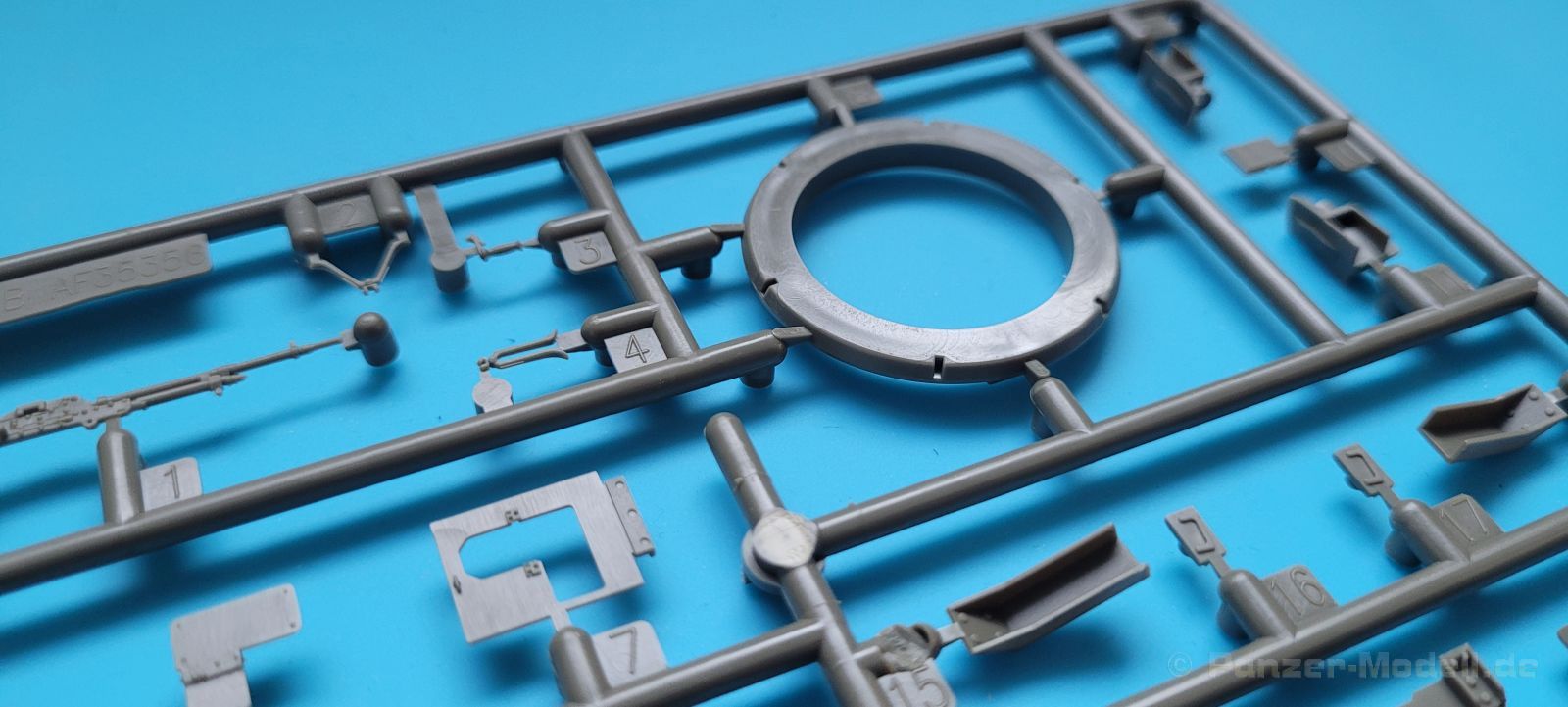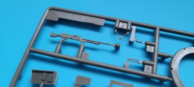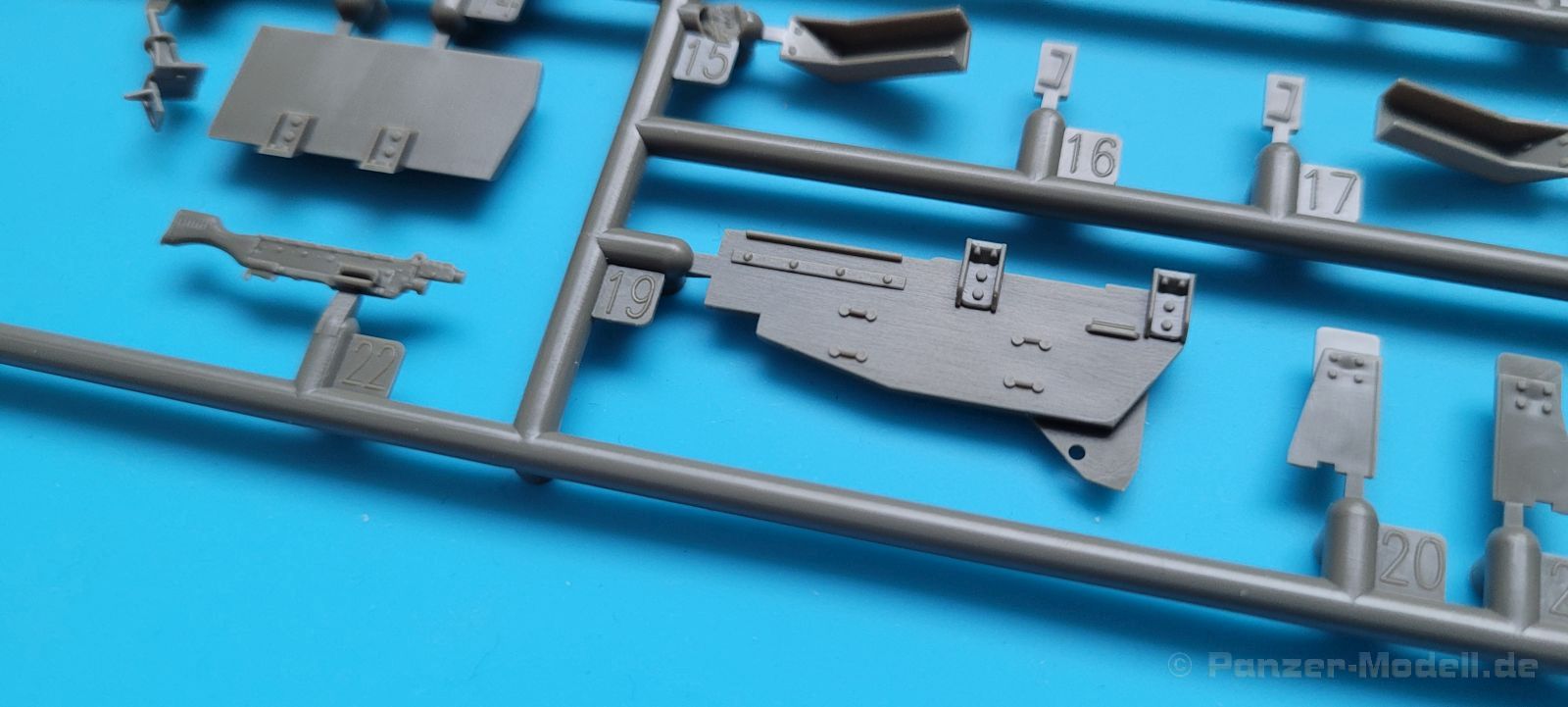 Für den Aufbau am YPR ist noch ein Spritzling mit Adapterring, den typischen Ablagefittings dieser Fahrzeuge und ein FN-MAG Maschinengewehr vorhanden.