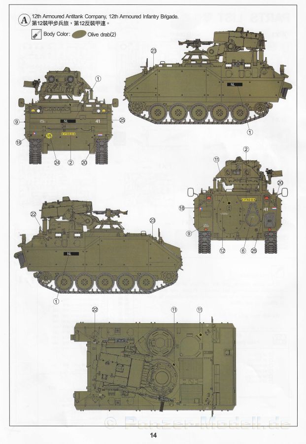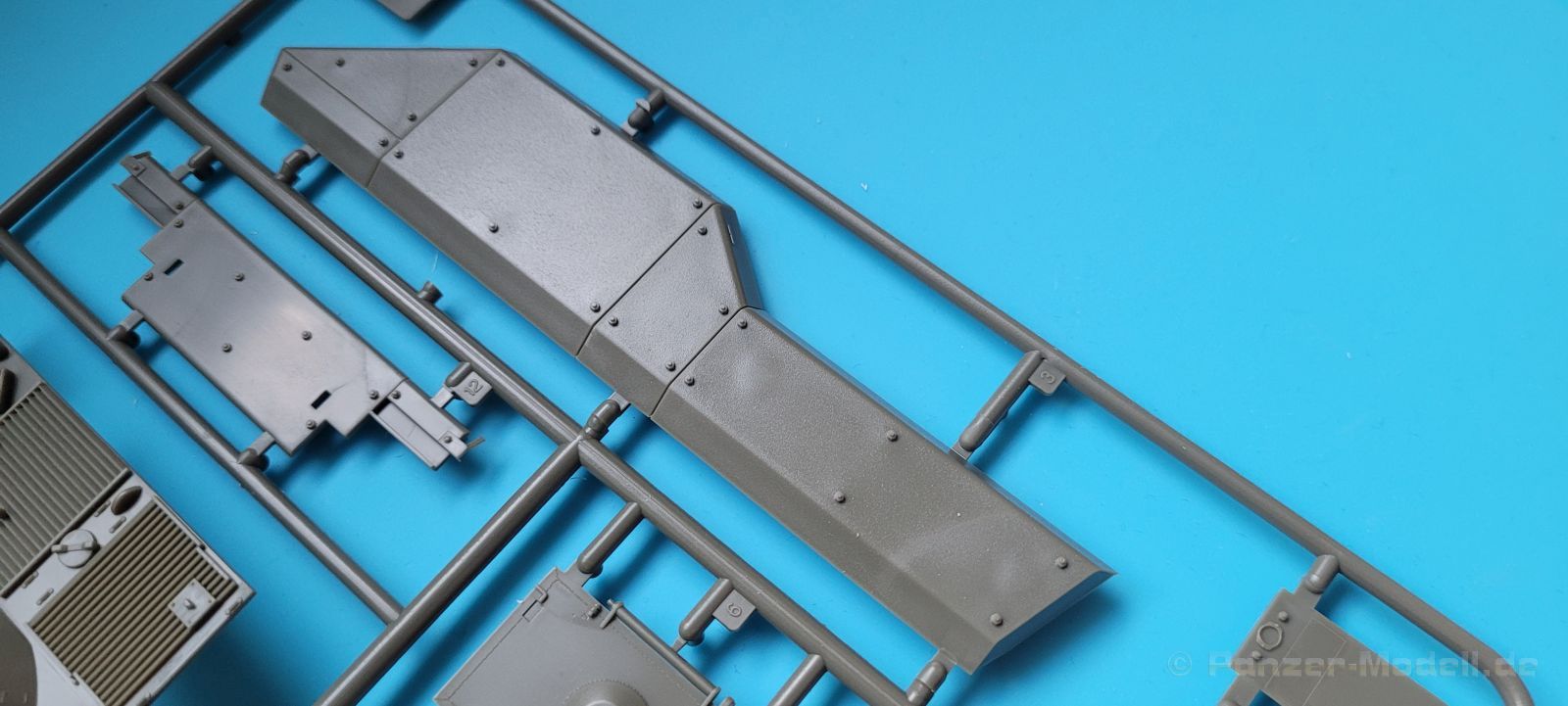 Aufgrund der vorhandenen Kette kann man aus dem Karton ein Fahrzeug bis ca. Ende der 80er Jahre bauen, da dann die Niederländer auf die Diehl Kette umgerüstet haben.