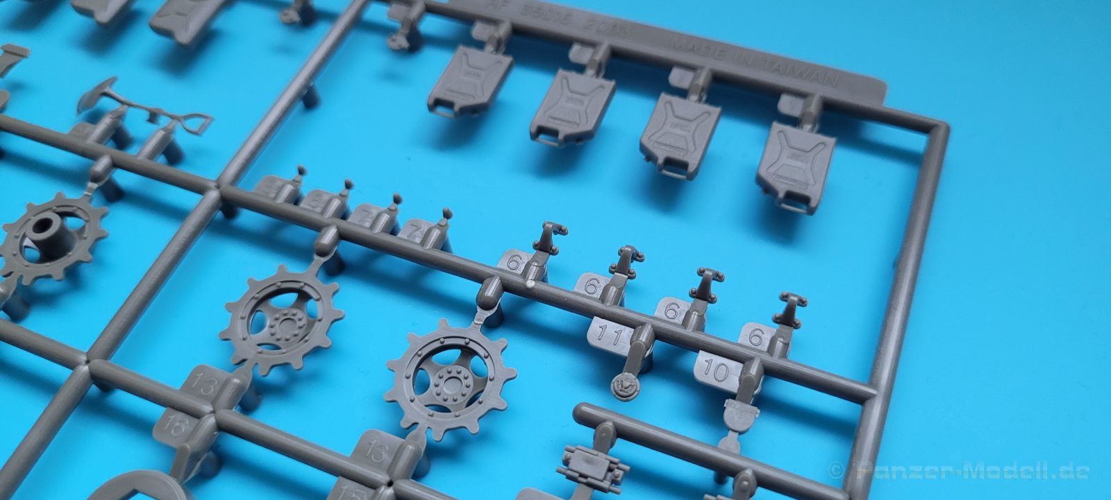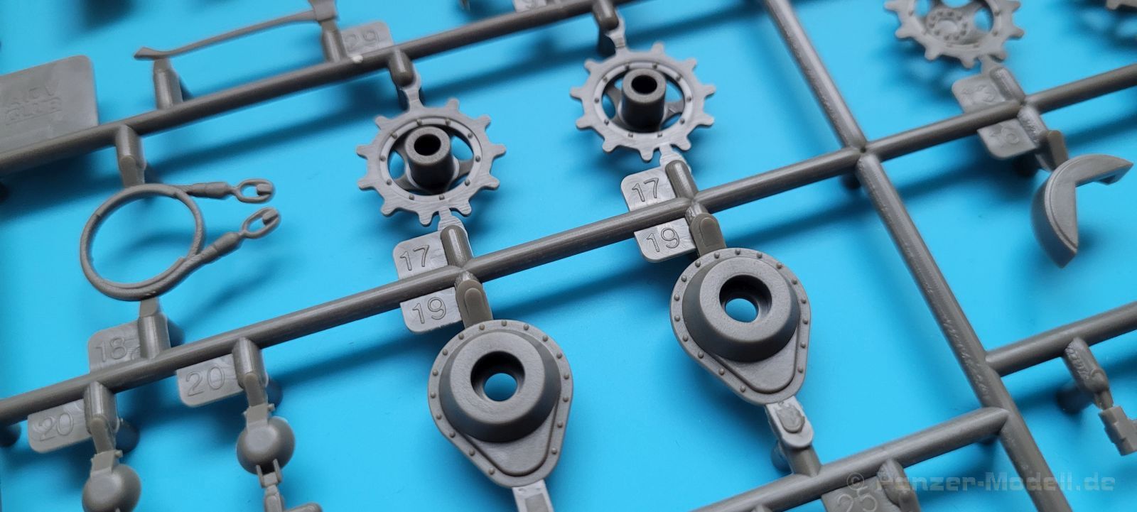 Die Treibräder für die späten Diehl Ketten liegen zwar bei, aber hier werden die älteren für die US Kette genutzt, wer sich im Aftermarket die Diehl Ketten besorgt, findet also auch die Möglichkeit, den Bausatz hiermit auszustatten.
