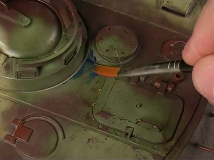 Einer der interessantesten Effekte, der hier genau dargestellt wird, ist das fading - hier werden großzügig verschiedene Ölfarben auf das Modell getupft und dann mit Verdünner ineinander und das Modell übergeblendet um am Modell Farbschatten, Laufspuren und Nuancen zu erzielen, die dem Realismus zugute kommen. Interessant hierbei, an welchen Stellen man logischerweise welche Farben verstärkt auftupft.