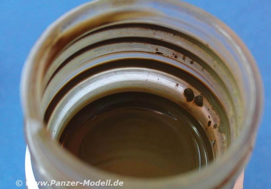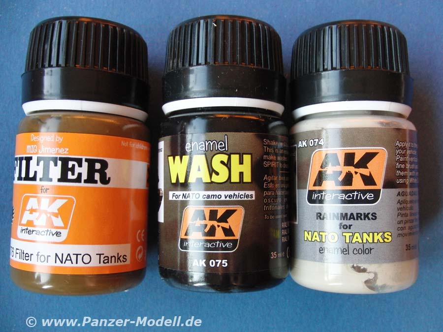 AK-076 ist eine Farblösung die bräunlich gemischt ist und mit der man dem Dreifarb Tarnanstrich der NATO mittels Filtering etwas farbliche Tiefe verleihen kann.