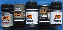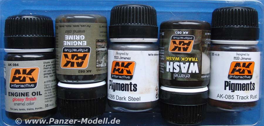 Die enthaltenen Weathering Produkte sind AK-082 (Engine Grime), AK-083 (Track Wash), AK-084 (Fresh Engine Oil), AK-085 (Track Rust Pigment) und AK-086 (Dark Steel Pigment).
