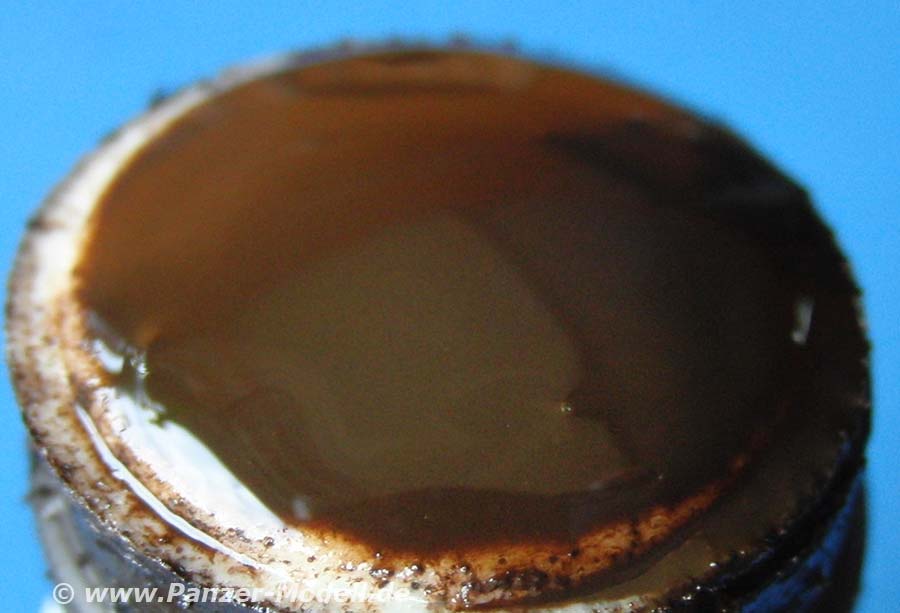 AK-084 ist eine Farblösung die ölig bräunlich gemischt ist und so an Motoren und anderen Fahrzeugbereichen an denen ölige und fettige Flüssigkeiten auslaufen können oder eingefüllt werden - das glänzende Finish bereitet einen realistischen, versifften Eindruck.