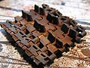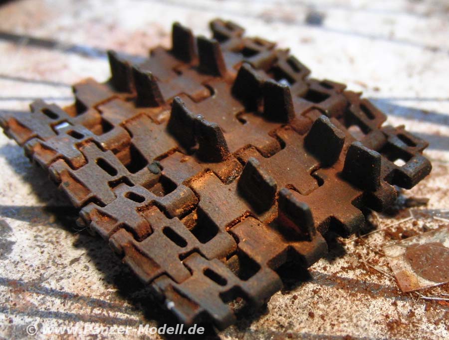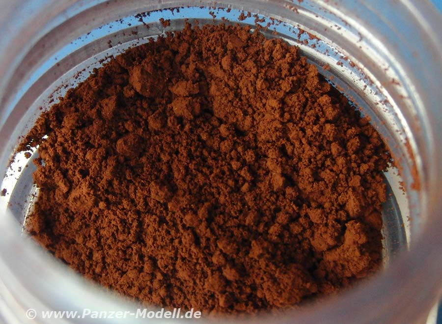 AK-085 ist ein feinkörniges, farbintensives, rotbraunes Pigment, das gelöst oder trocken aufgetupft werden kann um rostige Oberflächen an Metallen, wie z.B. an Ketten (siehe Foto) darzustellen.