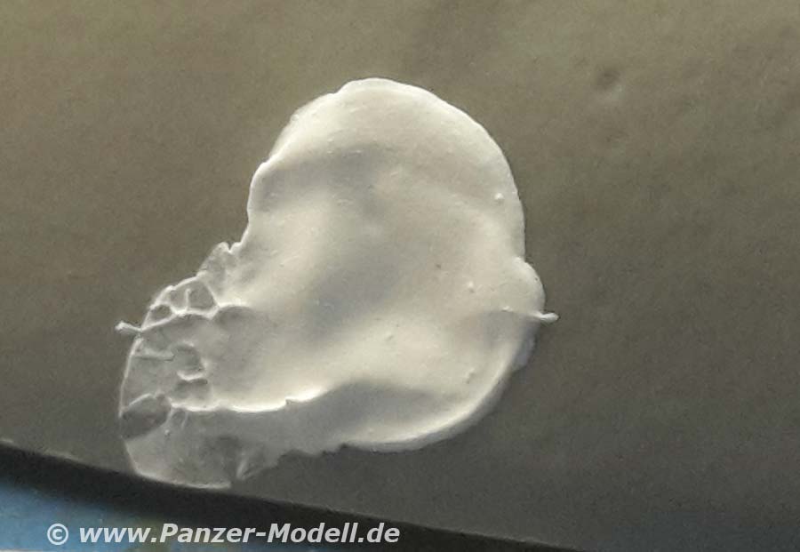 In der Tube sind 20ml, entsprechend 39 Gramm, weiße Spachtelmasse, die sich leicht aus der Tube drücken lassen. Die Dosierung direkt von der Tube aufs modell geht nur bei größeren Flächen aufgrund der recht großen Öffnung. Großer Vorteil als Acrylspachtelmaße - es gibt keinen penetranten Gestank, wie man ihn z.B. vom Tamiya Putty kennt. Ausserdem kann man Werkzeug, Finger und am Modell überflüssigen Spachtel ganz einfach mit Wasser entfernen.