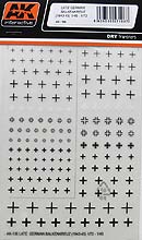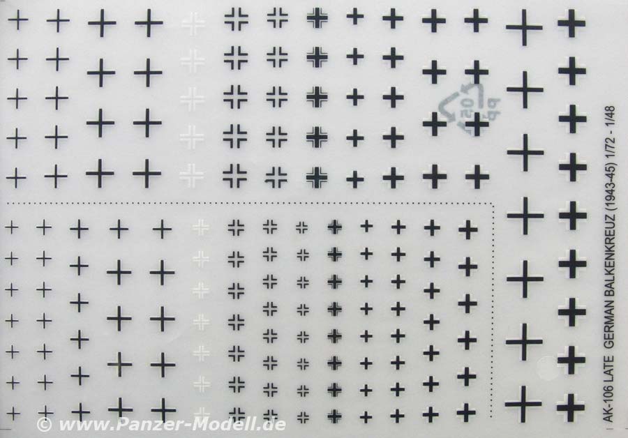Unter der Nummer AK-106 gibt es ein weiteres Trockenreibedecal Set, nämlich Late German Balkenkreuz 1/48 - 1/72.