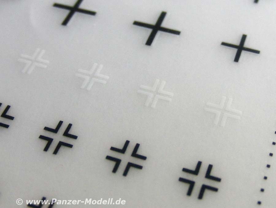 Das Set besteht aus eine sehr sauber gedruckten Bogen Trockenreibemarkierungen. Diese beinhalten über 100 Balkenkreuze für deutsche Fahrzeuge im Zeitraum 1943-45.