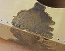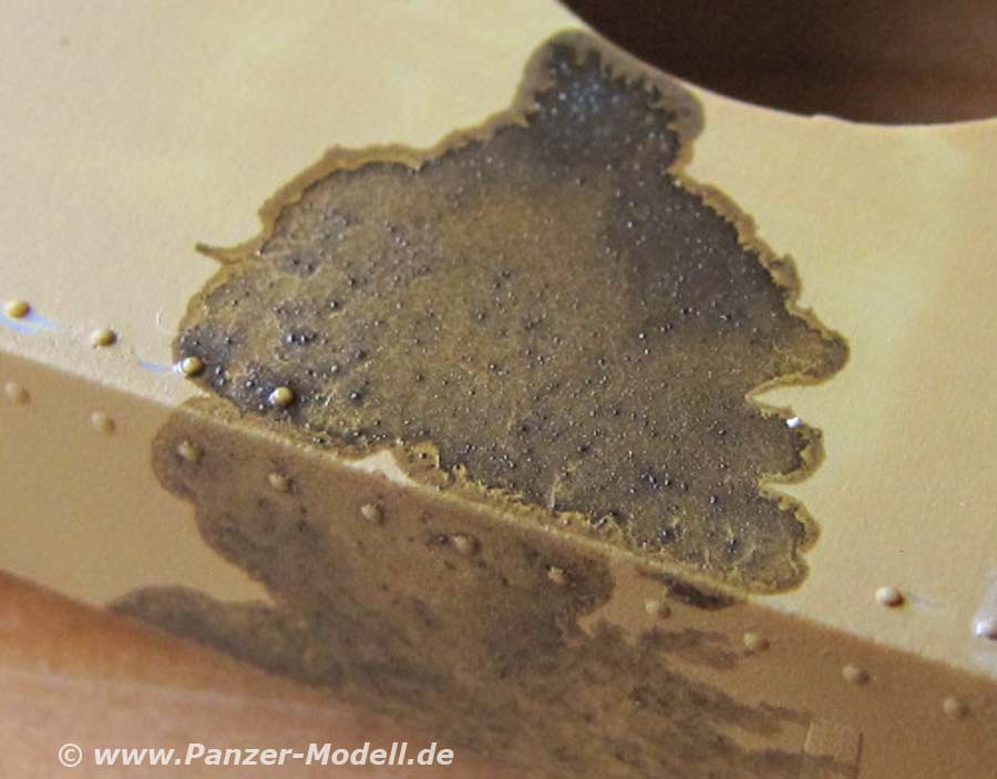 Dieses lässt sich durch mehrfaches Auftragen mehr oder weniger stark oder durch hinzufügen von White Spirit ganz leicht darstellen. Durch die flüssige Auftragung ist es etwas schwierig dieses räumlich exakt einzugrenzen, ergibt andererseits sehr gute Übergänge und Variationsmöglichkeiten. Man kann dadurch aber auch leicht Spritzer an Laufwerk und Panzerwanne mittels Pinsel und Airbrush darstellen. Das Finish ist jedenfalls schön dunkler Schlamm mit leicht feuchtem, glänzenden Effekt.