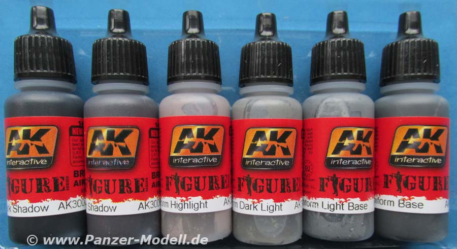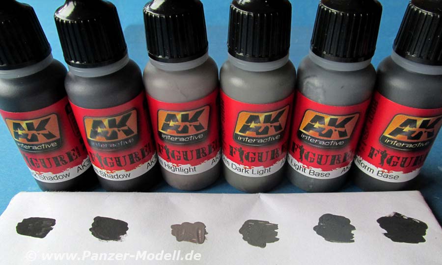 AK3002 Black Uniform Base Die vorliegenden Farben setzen für Figurenmaler einen neuen Maßstab, denn sie trocknen wirklich ultramatt auf - kein noch so leichtes Glänzen, es ist wirklich so matt wie Stoff nur sein kann und damit hier wahrlich eine Meisterleistung. Die Farbe ist für Pinselbemalung ausreichend verdünnt, lässt sich aber entsprechend nachverdünnt auch per Airbrush verarbeiten. Die 17ml Tropffläschchen sind in bewährter Form in der man schön einfach die Farbe entnehmen und ggf. tropfengenau dosieren kann. Das Farbset kostet 14,- EUR und kann direkt bei AK-interactive oder im örtlichen gut sortierten Modellbaufachhandel bezogen werden.