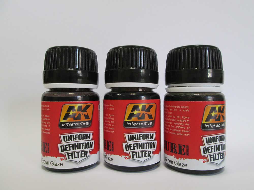 AK3017 Green Glaze Möchte man eine Figur mit Schattierungen auf der Uniform versehen bekommt man mit diesem Farbset alles was das Her begehrt. Es lassen sich sowohl grüne, helle, z. B. sandfarbene wie auch sehr dunkle Uniformen, z. B. die schwarze Uniform der deutschen Panzersoldaten, bemalen, bzw. mit einem Filter versehen um die Details noch wirkungsvoller erscheinen zu lassen. Tja, was soll man sagen? Mit dem Kauf eines Sets hat man die Möglichkeit alle erdenklichen Farben / Farbvarianten von Uniformen aus dem militärischen, aber auch im zivilen oder im Fantasy Bereich zu bemalen. Laut Aufdruck auf den Gläsern sollen diese Filter absolut matt trocknen. Direkt im Behälter ist zwischen diesen drei Filtern ein deutlicher Farbunterschied zu erkennen. Auf den Fotos ist dieser jedoch kaum zu bemerken. Daher habe ich auch nur Fotos von zwei geöffneten Gläsern beigefügt. Aber ihr könnt mir glauben, es sind ein Grünton und jeweils ein heller und ein dunkler Braunton enthalten. Das Farbset kostet 10,50 EUR und kann direkt bei AK-interactive oder im örtlichen gut sortierten Modellbaufachhandel bezogen werden.