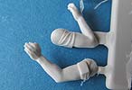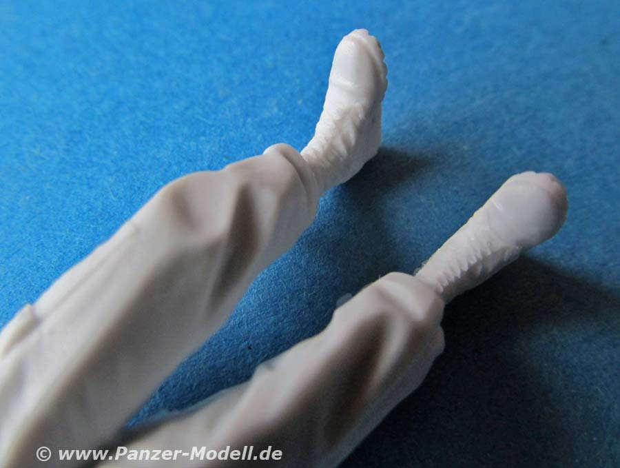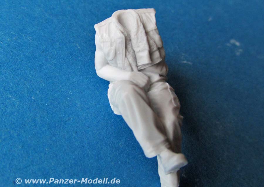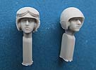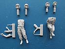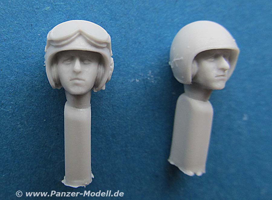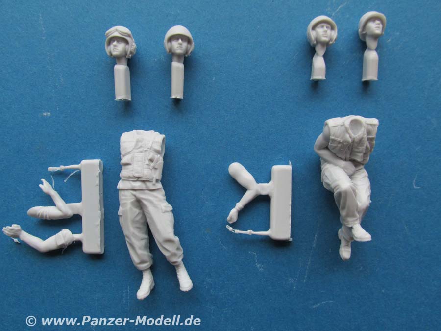 Beide Figuren sind quasi komplett gegossen. Bei beiden müssen lediglich noch Kopf und Arme angeklebt werden, wobei bei der sitzenden Figur sogar nur noch ein Arm angeklebt werden muss. Wie gewohnt liegen für jede Figur 2 Köpfe zur Auswahl bei. Diese sind sehr schön modelliert und bieten für die "stehende" Figur je einen Kopf mit dem Panzerhelm mit darunterliegenden Kopfhörern, einmal mit, einmal ohne Staubschutzbrille. Die sitzende Figur hat auch einen Kopf mit Panzerhelm und einmal mit normalem US Gefechtshelm. Für die Mikrophone liegt jeder Figur ein feines Resinteil bei