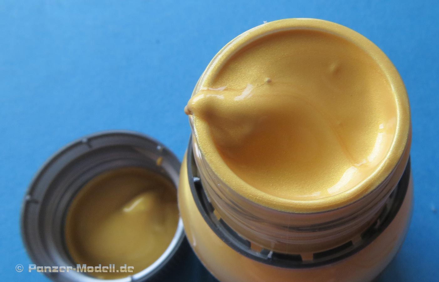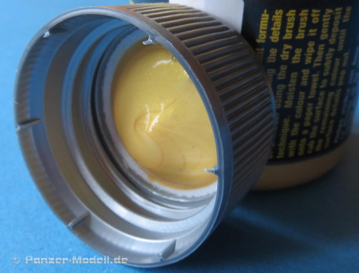Hier sollte man vorher an einer weniger sichtbaren Stelle am Modell den Farbkontrast prüfen, damit Grundfarbe und Trockenmalfarbe nicht zu ähnlich sind, denn für eine optimale Wirkung muss der Kontrast hoch genug sein. Besonders bei dieser Farbe sollte man dann auch noch die Trocknung abwarten, wie sich diese dann im Vergleich zur Grundfarbe verhält.