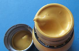 Die Farbe besitzt eine recht hohe Konsistenz und sehr hohe Pigmentdichte an augenscheinlich sehr feinen Pigmenten. Es handelt sich dabei um eine wasserbasierte Acrylfarbe ohne Geruch, ist ungiftig, trocknet schnell und die benutzten Pinsel lassen sich einfach unter Wasser auswaschen - all das sind Vorteile gegenüber den sonstigen Ölfarben für das Trockenmalen.