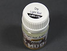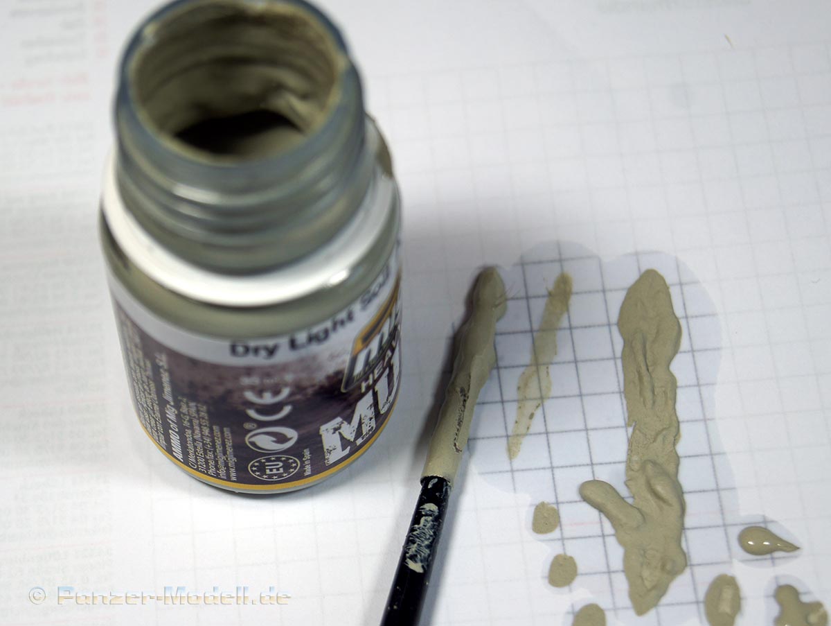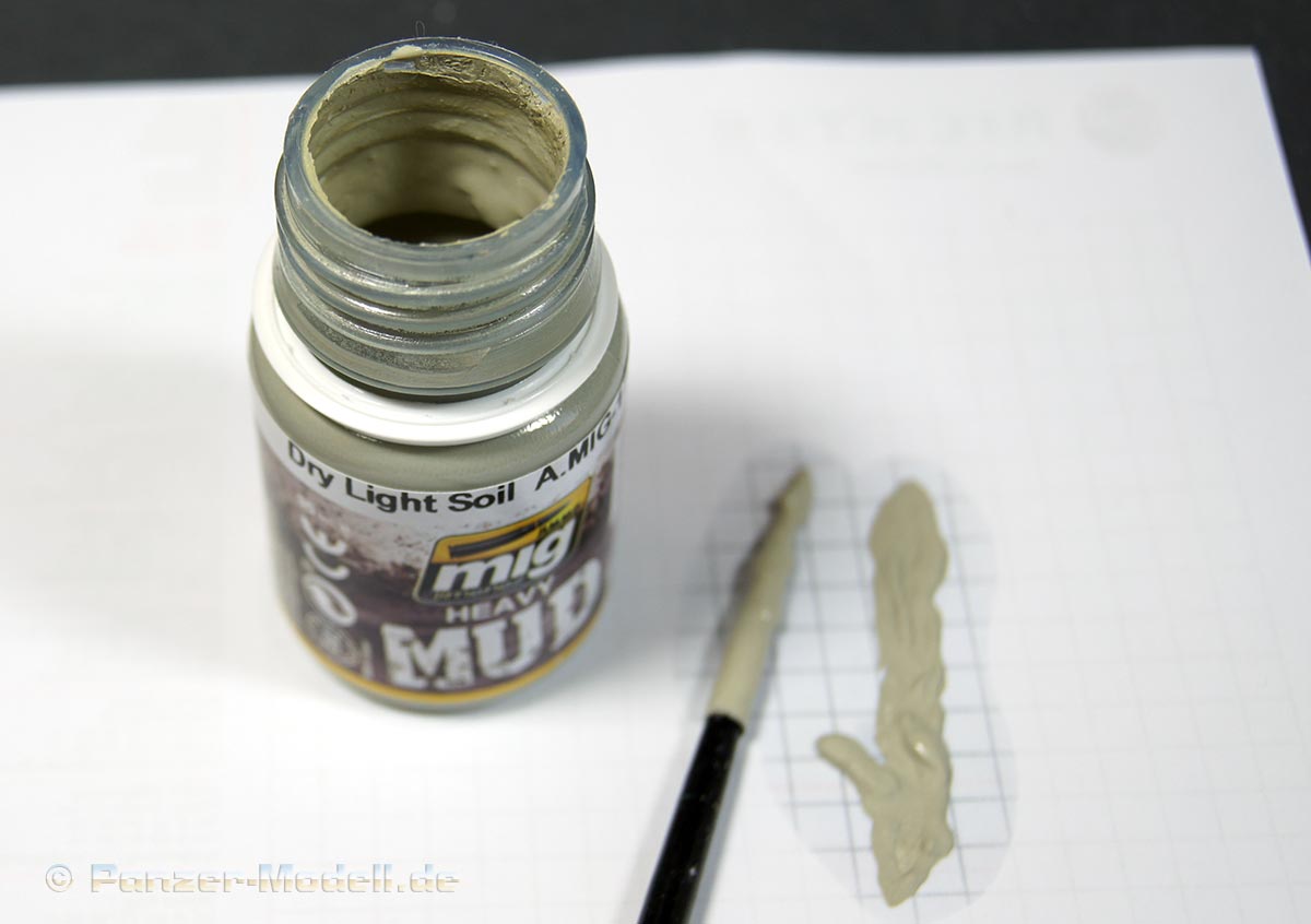 Unter dem Namen Dry light Soil verbirgt sich ein bereits fertiges Produkt um Matsch darzustellen. Die Übersetzung würde ich als trocken, hellen Matsch umschreiben. Die Konsistenz würde ich als frisch angerührten Gips am besten beschreiben. Die Farbe erinnert ebenfalls an feuchten Gips. Der Matsch kann je nach bedarf weiter verdünnt werden mit Verdünnern auf Emaillebasis. Mit dem Verdünner lassen sich auch Pinsel, Werkzeuge etc. reinigen. Der Anwender erhält hier ein Produkt um trockenen Matsch im Gelände, am Fahrzeug usw. darzustellen. Ein vielseitiges Produkt das dem Modellbauer ein fertiges Produkt an die Hand gibt die sich in Farbe und Form varieren lässt.